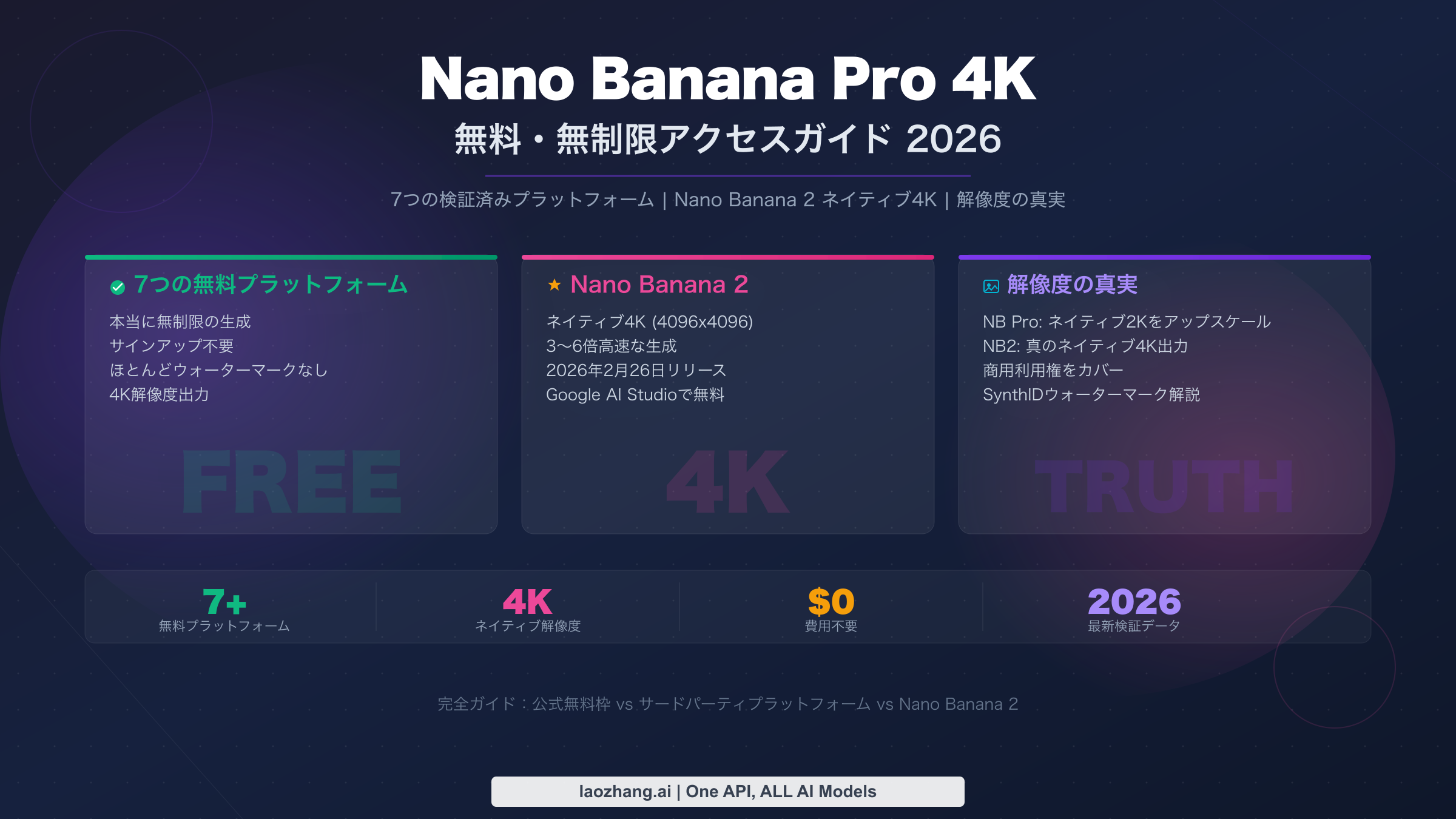 Nano Banana Proは無料で利用できますが、公式の無料枠では1日たった2枚の画像しか生成できず、解像度は1024x1024、さらにウォーターマークも付きます。本当に無制限の4Kアクセスを得るには、Ima Studio、VisualGPT、NanoBanaPro.comなど7つのサードパーティプラットフォームが、サインアップ不要で無料生成を提供しています。さらに、Nano Banana 2(2026年2月26日リリース)は、Google AI Studioを通じてネイティブ4K画像を無料で生成できるようになりました。本ガイドでは、すべての無料オプションを比較し、「4K」という表記の解像度に関する真実を明らかにし、プラットフォームを横断して無料生成を最大化する方法を解説します。