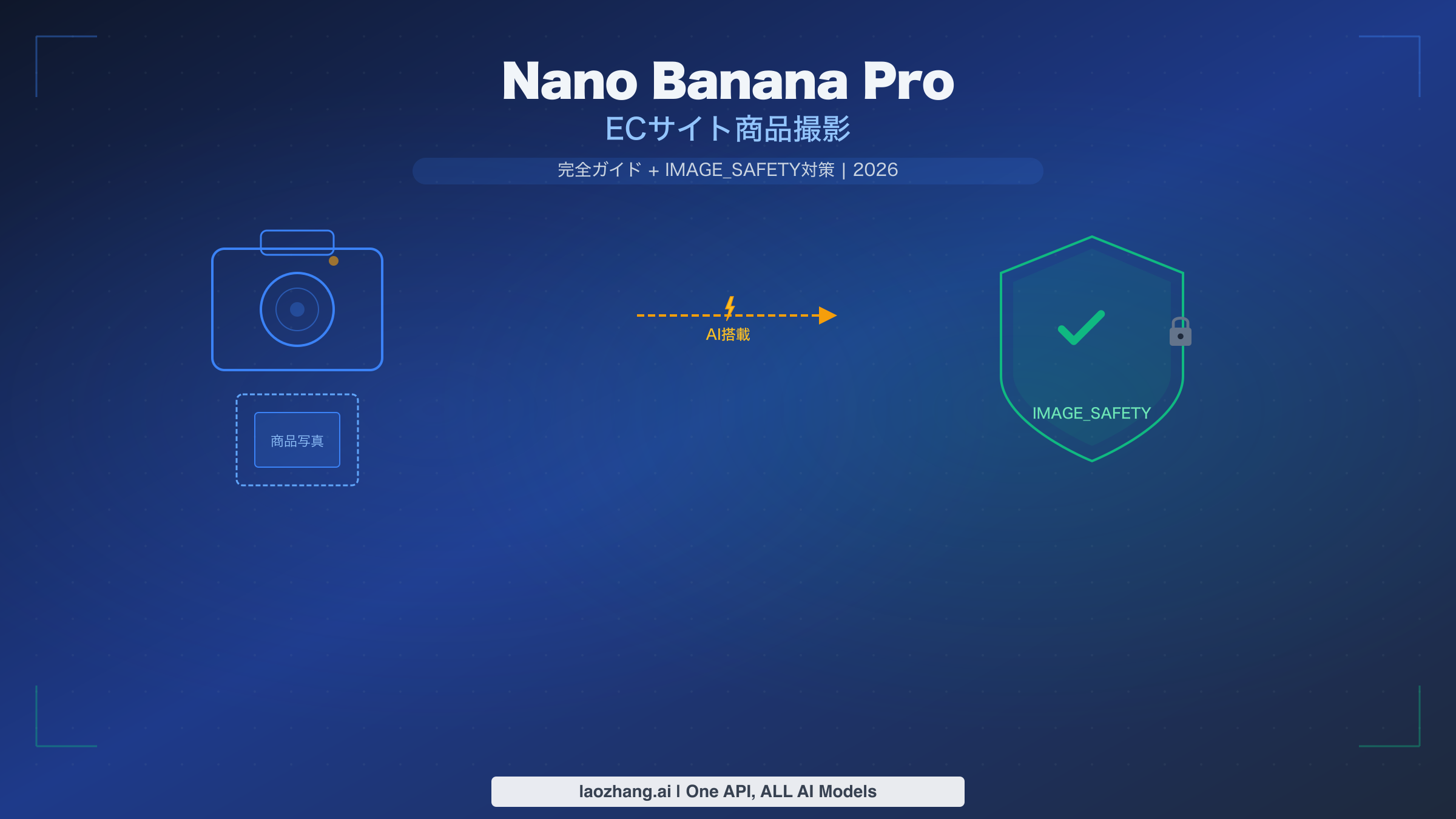 Nano Banana Pro(Gemini 3 Pro Image)は、1枚あたり$0.134(公式API、2026年3月時点)またはlaozhang.aiなどのサードパーティプロバイダー経由で$0.05でスタジオ品質のEC商品画像を生成します。4K解像度出力、リアルなライティング、素材の正確な再現に優れています。ファッション・アパレルカテゴリに偏って発生するIMAGE_SAFETYエラーは、API設定では無効化できないサーバーサイドの非設定可能フィルターに起因します。最も効果的な解決策は、プロフェッショナルなプロンプトエンジニアリング(人物中心から商品中心の表現への転換)とスマートリトライロジックの組み合わせで、以前ブロックされていたコンテンツに対して80〜95%の成功率を達成できます。