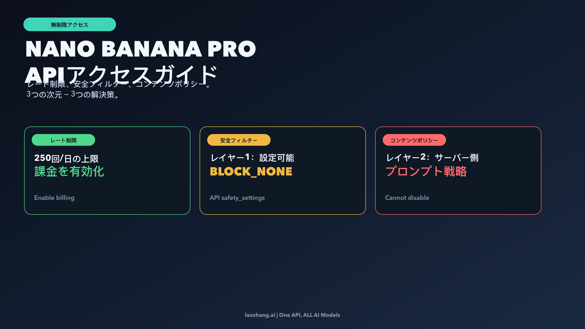 Nano Banana Pro APIには3種類の制限があり、それぞれ異なる解決策が必要です。レート制限(250 RPDの上限)はGoogle Cloudの課金を有効化するか、laozhang.ai(1画像あたり$0.05、制限なし)などのサードパーティプロバイダーを利用することで解除できます。安全フィルター(Layer 1)はAPIのsafety_settingsパラメータでBLOCK_NONEに設定可能で、これはGoogleが公式にドキュメント化している機能です。コンテンツポリシー(Layer 2 IMAGE_SAFETY)はAPIパラメータでは無効化できないため、プロンプトエンジニアリングとリトライ戦略で対処する必要があります。2026年3月現在、Nano Banana Proには無料APIティアは存在しません。