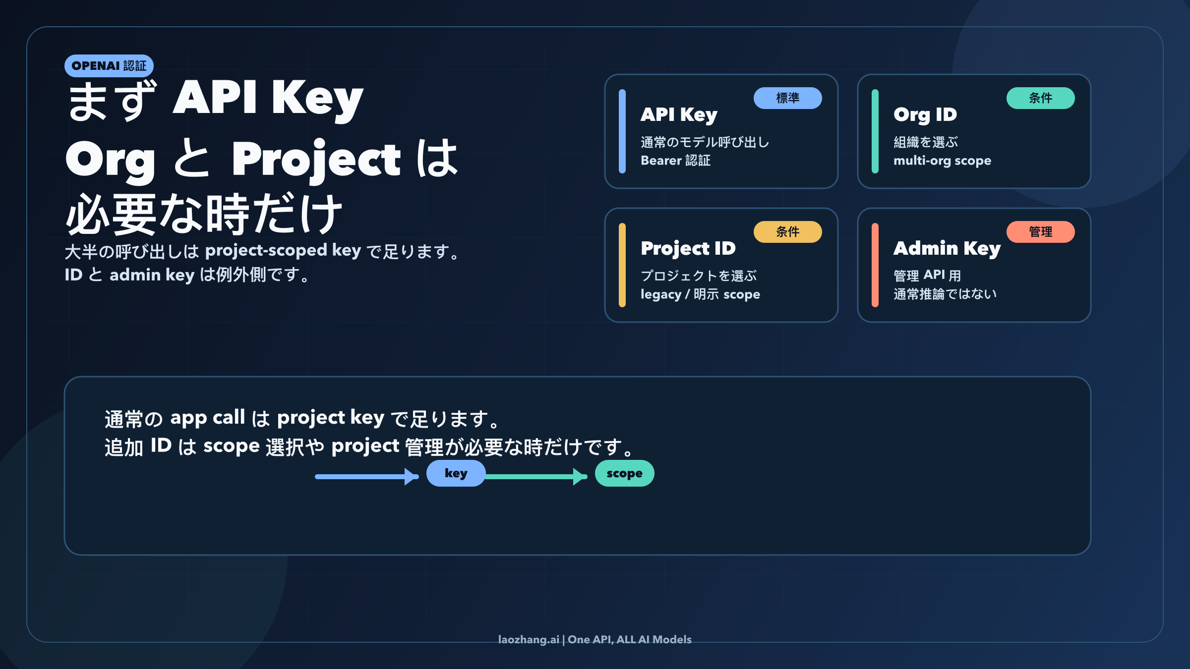 OpenAI API の auth はもう project-first です。多くの開発者にとって、API を呼ぶために本当に必要な secret は OPENAI_API_KEY です。Organization ID と Project ID もまだ存在しますが、すべての request に当然のように添える固定ペアではありません。必要になるのは、scope を明示的に選ぶ必要がある時です。典型的には、複数の organizations に所属している、legacy user-key flow を扱っている、あるいは通常の model inference ではなく management endpoints を呼んでいる時です。