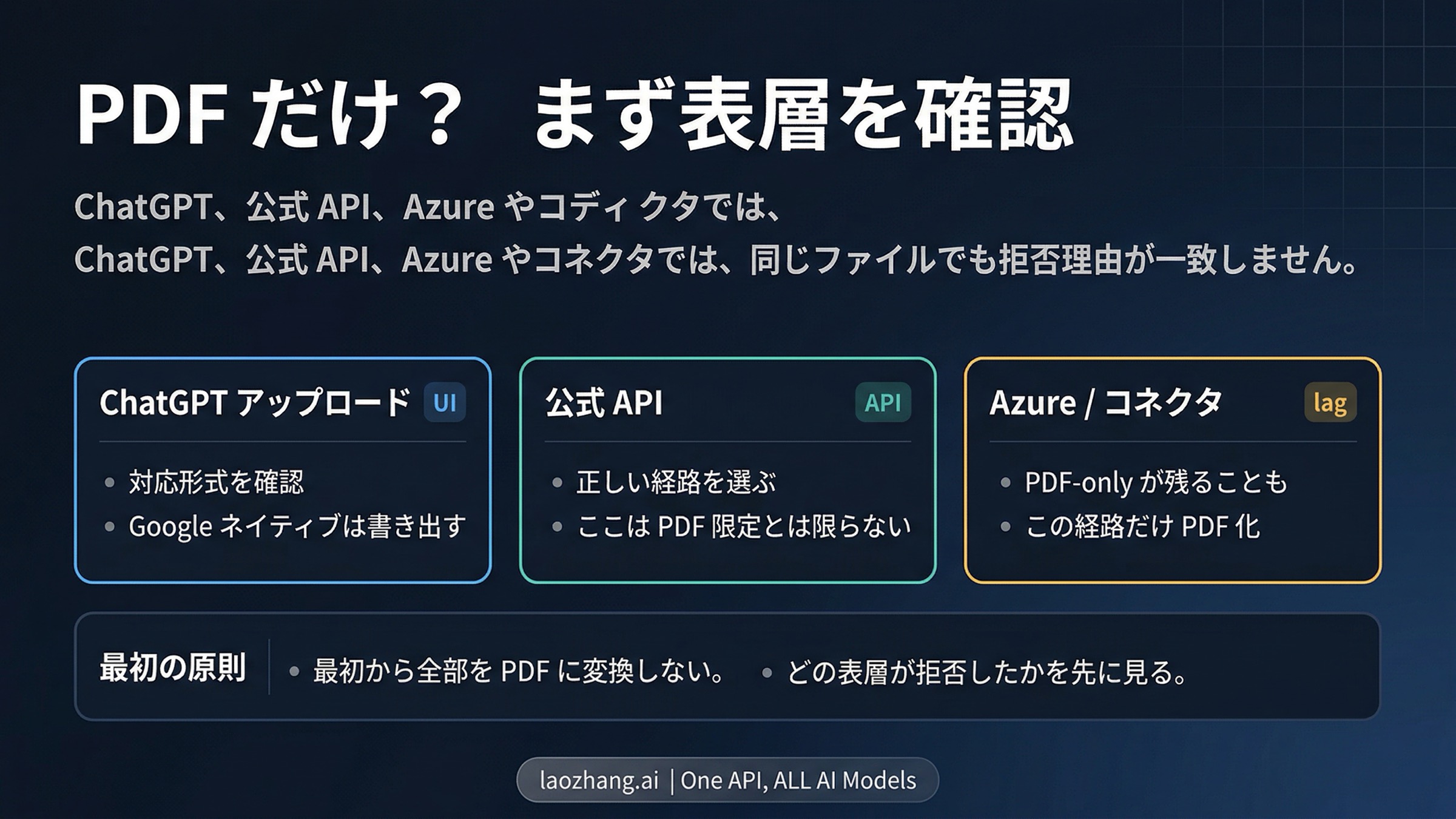 OpenAI で「ファイル形式がサポートされていません」と表示され、「PDF で再試行してください」と言われても、すぐに全部を PDF に変換しないでください。ChatGPT のアップロード、現在の公式 OpenAI API、Azure や他の connector では、まだ別々のルールでファイルを受け付けていることがあります。だから最初の正解は拡張子を変えることではなく、どの入口で拒否されたのかを見極めることです。