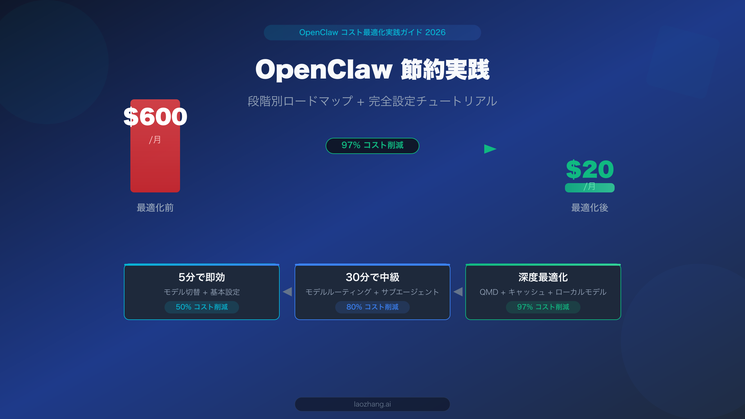 各段階は独立して実行できます。第1段階から始めて、自分の技術レベルと時間に応じて段階的に進めることをお勧めします。第1段階だけでも、請求書の大幅な削減を即座に実感できます。半日かけて3段階すべてを完了すれば、OpenClaw の月額費用は $600 から $20 以下へ。これが本記事のタイトルの約束であり、検証済みの実際の数字です。