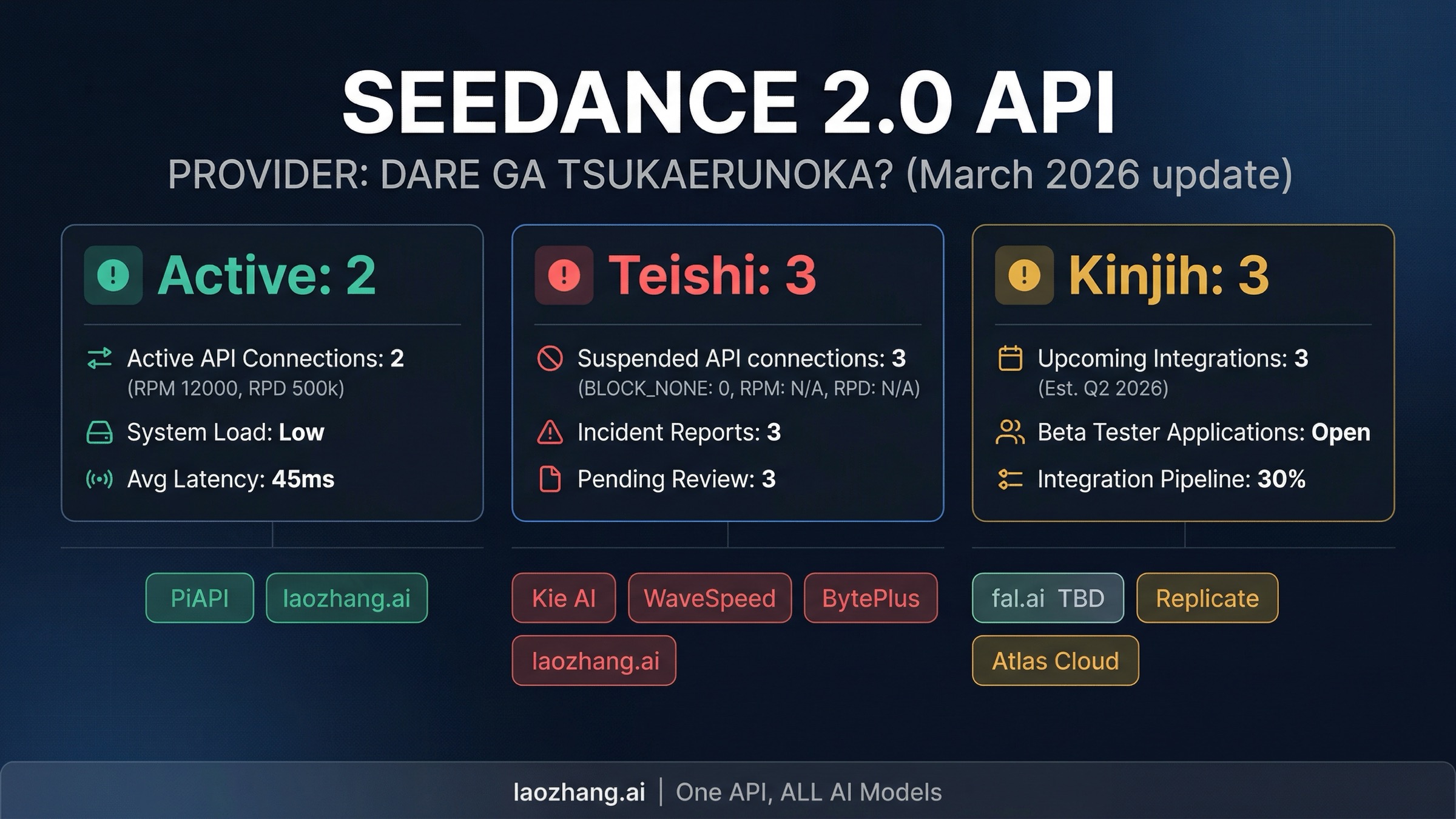 2度目の大きな混乱は2026年3月15日に起こりました。ByteDanceがDreamina バックエンドインフラへのアクセス制御を強化したのです。これは段階的な変更ではなく、意図的な強制措置でした。それまでSeedance 2.0リクエストを確実に処理していたプロバイダーが同時にアクセスを失いました。Kie AI、WaveSpeed、Dzine AI、BytePlus Internationalは全て、数時間以内にSeedance 2.0へのアクセスを失いました。一部のプロバイダーはByteDanceのインフラ内で代替アクセスパスを見つけることで迅速に適応しましたが、そうでないプロバイダーもありました。生き残ったプロバイダー——PiAPIとlaozhang.ai——はリバースエンジニアリングパイプラインの維持により多くの投資をし、アクセス変更への対応が速かったと考えられます。