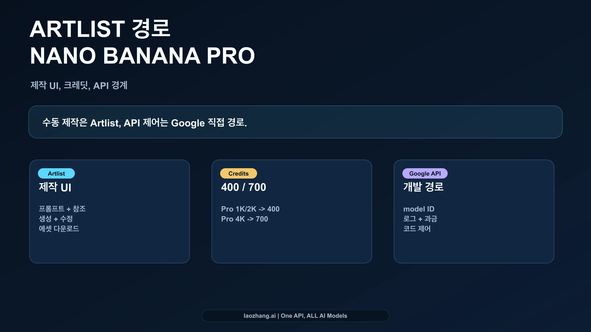 아닙니다. Artlist는 제작 UI, Artlist 계정, Artlist credits, Artlist 이용 조건으로 쓰는 루트입니다. Gemini API에서는 Nano Banana Pro가 gemini-3-pro-image-preview로 매핑되고, 개발자 billing과 요청 제어로 사용합니다.