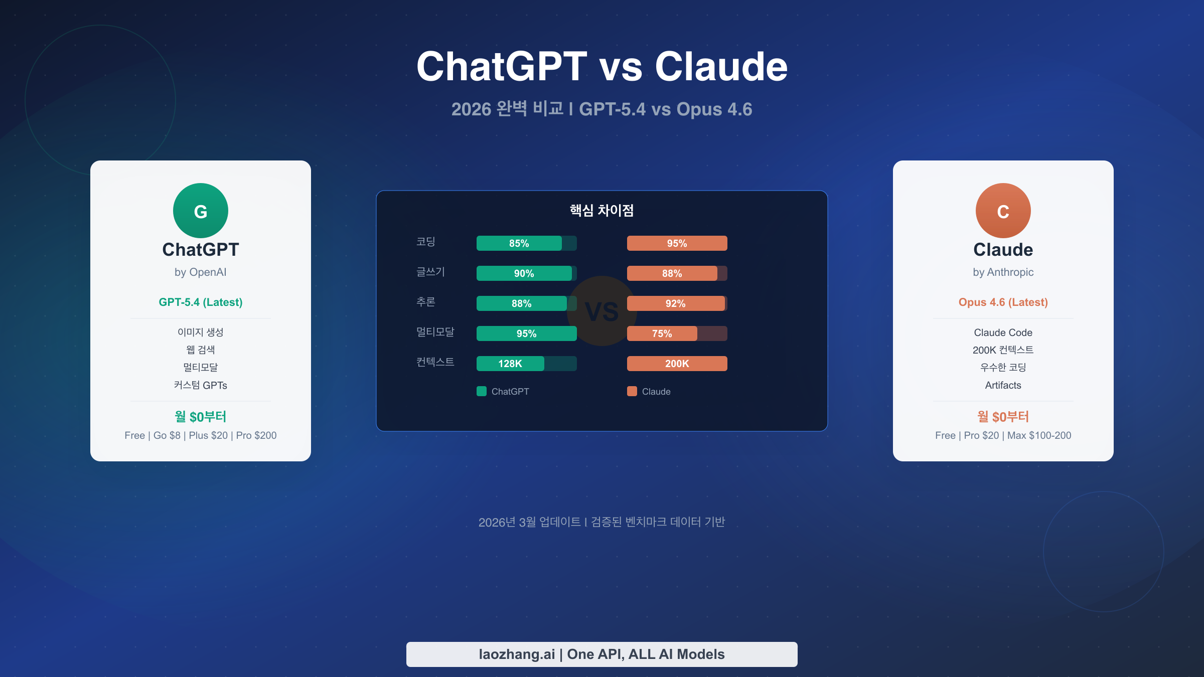 2026년 3월 현재, ChatGPT와 Claude는 소비자와 개발자 모두에게 가장 뛰어난 AI 어시스턴트로 자리매김하고 있습니다. OpenAI의 GPT-5.4를 탑재한 ChatGPT는 이미지 생성, 고급 음성 모드, 웹 검색을 포함한 비할 데 없는 멀티모달 기능을 제공합니다. Anthropic의 Opus 4.6 기반 Claude는 코딩 정확도, 심층 추론, 그리고 업계 최고 수준인 200K 컨텍스트 윈도우를 활용한 장문 분석에서 두각을 나타냅니다. 두 플랫폼 모두 무료 플랜과 월 $20의 기본 구독을 제공하므로, 접근성이 아닌 어떤 강점이 자신의 구체적인 필요에 맞는지가 선택의 핵심입니다. 본 가이드에서는 벤치마크 점수부터 API 경제성까지 모든 중요한 차원에서 데이터 기반 비교를 제공하여 정보에 근거한 결정을 내릴 수 있도록 돕겠습니다.