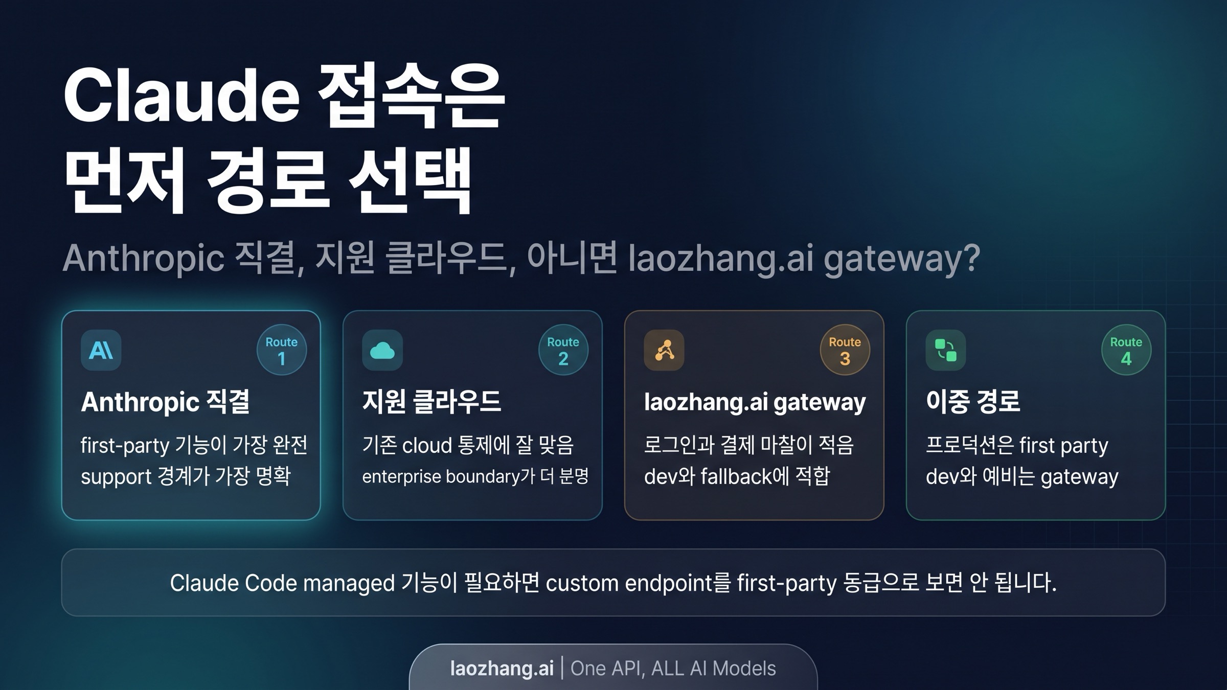 Claude나 Claude Code를 안정적으로 쓰고 싶다면, 먼저 갈라야 할 것은 Anthropic 직결, 지원 클라우드, 그리고 laozhang.ai 같은 호환 게이트웨이라는 세 가지 접속 경로입니다.