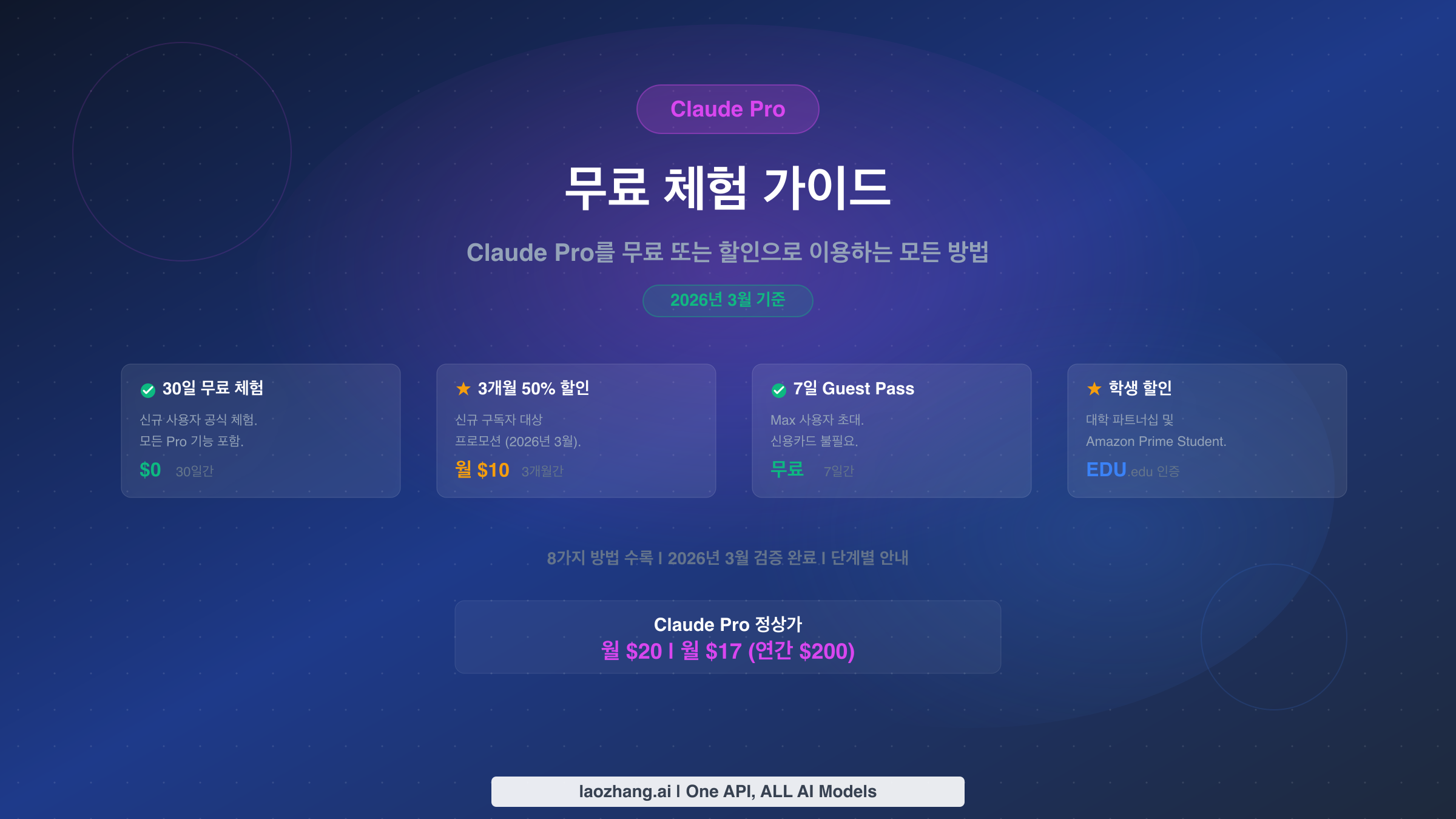 Claude Pro는 신규 사용자에게 무료 체험을 제공합니다. 2026년 3월 기준으로 claude.ai에서 결제 수단을 등록하고 가입하면 30일간 완전한 무료 체험을 받을 수 있습니다. Anthropic은 주기적으로 3개월간 50% 할인(월 $20 대신 $10) 및 Max 구독자를 통한 7일 Guest Pass 등의 프로모션도 진행합니다. 학생은 Amazon Prime Student 번들과 대학 파트너십을 통해 Claude Pro에 접근할 수 있습니다. 이 가이드에서는 Claude Pro를 무료 또는 할인으로 이용하는 8가지 검증된 방법을 각각 단계별 안내와 함께 소개합니다.