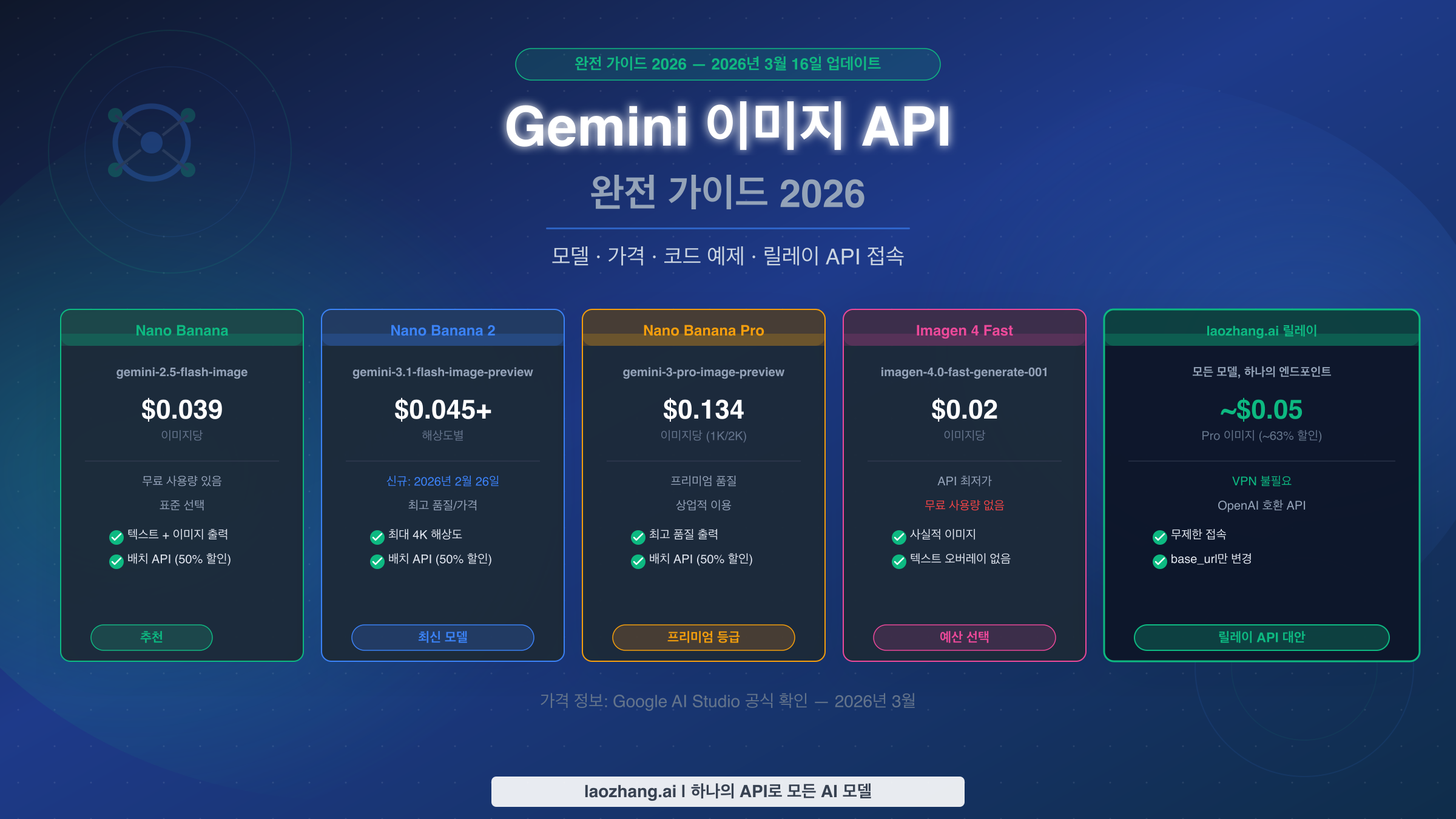 Gemini 이미지 API는 2026년 현재 개발자에게 5가지 이미지 생성 모델을 제공합니다. Nano Banana(gemini-2.5-flash-image, $0.039/이미지부터), Nano Banana 2(gemini-3.1-flash-image-preview, 2026년 2월 26일 출시, 1K 해상도 기준 $0.045/이미지부터), Nano Banana Pro(gemini-3-pro-image-preview, $0.134/이미지), 그리고 $0.02~$0.06/이미지 범위의 세 가지 등급 Imagen 4가 있습니다. Google AI Studio는 개인 개발자에게 하루 약 500건의 무료 요청을 제공합니다. Google API 접속이 제한된 지역의 개발자나 비용 절감을 원하는 분들에게는 laozhang.ai와 같은 릴레이 솔루션이 동일한 API 호환성을 저렴한 가격으로 제공합니다. 이 가이드는 2026년 Gemini 이미지 생성을 애플리케이션에 통합하기 위해 필요한 모든 것을 다룹니다: 모델 선택, 단계별 설정, 3가지 언어 실용 코드, 전체 가격 정보, 릴레이 옵션까지.