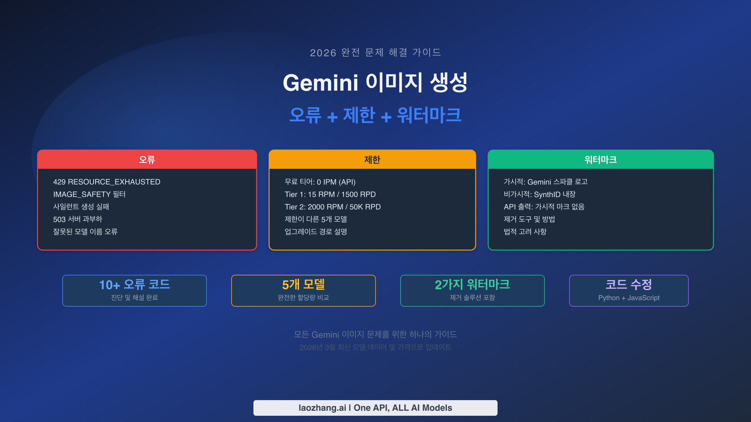 Gemini는 2026년 현재 5가지 이미지 생성 모델을 제공하며, 각 모델마다 오류 동작, 속도 제한, 워터마크 정책이 모두 다릅니다. 4가지 완전히 다른 문제에 대해 동일하게 나타나는 429 RESOURCE_EXHAUSTED 오류가 발생하든, 무료 티어 API에서 이미지가 전혀 생성되지 않는 이유를 이해하려 하든, 클라이언트가 원하지 않는 Gemini 스파클 로고가 생성된 이미지에 왜 있는지 알고 싶든, 이 가이드는 모든 문제를 한 곳에서 다룹니다. 모든 데이터는 2026년 3월 기준 공식 ai.google.dev 가격 및 속도 제한 문서를 기반으로 검증되었습니다.