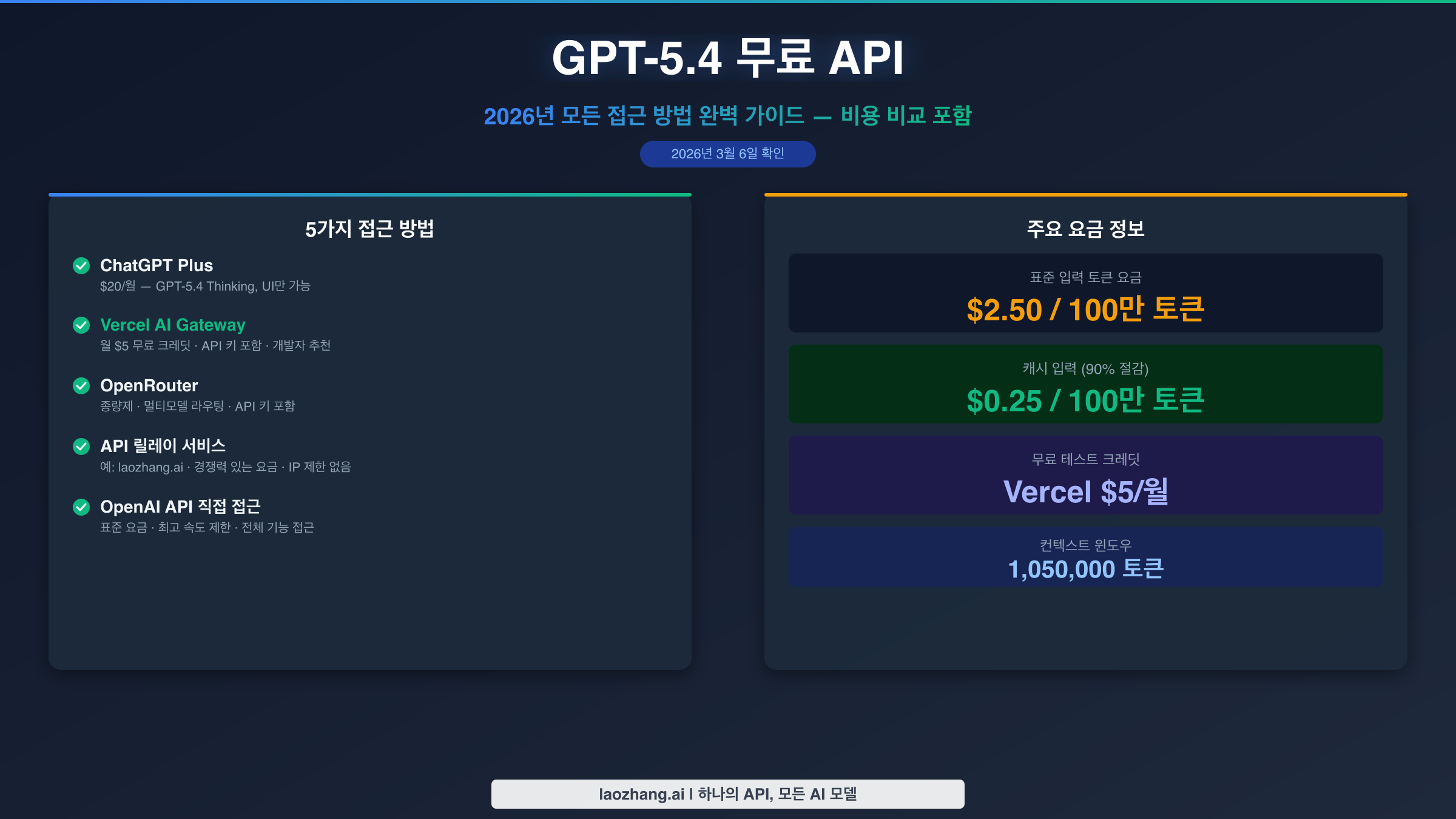 | Vercel AI Gateway | $5 무료 크레딧/월 | 있음 | 완전한 GPT-5.4 (표준) | 개발자 테스트 |
