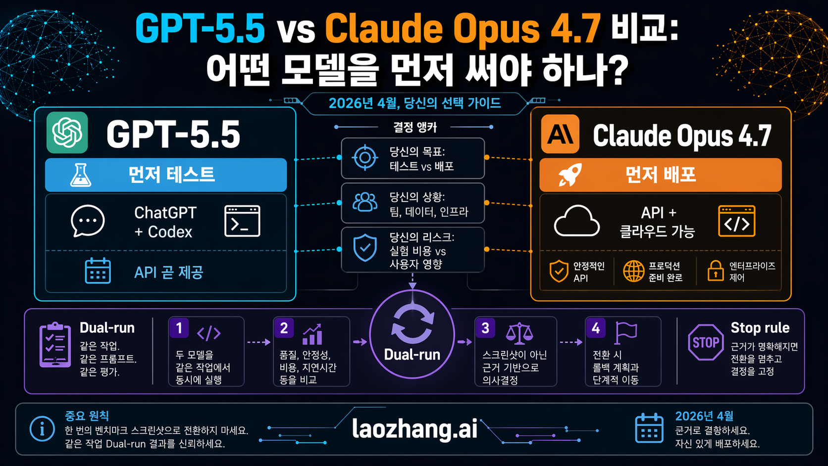 그래서 먼저 물어야 할 것은 “누가 이겼나”가 아니라 “내 작업이 어느 경로에서 돌아가나”입니다. ChatGPT, Codex, OpenAI 내부 코드 작업, 사람 리뷰가 중심이면 GPT-5.5를 먼저 테스트할 수 있습니다. 서버 API, cloud endpoint, rollout, 로그, 권한, fallback이 오늘 필요하면 Claude Opus 4.7을 먼저 평가해야 합니다. 이미 돈을 벌거나 고객에게 닿는 기본 모델을 바꾸려면, 같은 작업으로 두 모델을 모두 돌리기 전에는 전환하지 않는 것이 맞습니다.