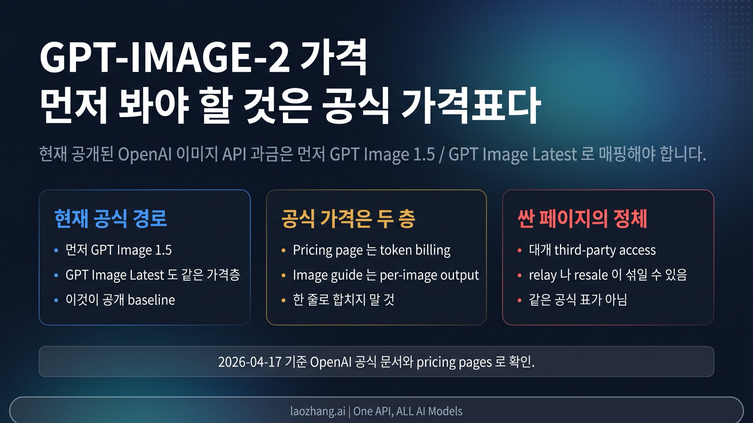 gpt-image-2 API 가격을 찾을 때 가장 먼저 고정해야 할 사실은 하나입니다. OpenAI 공개 가격표에는 지금 gpt-image-2 라는 독립된 공식 가격 행이 없습니다. 2026년 4월 17일 기준으로 공개된 OpenAI 이미지 API 과금을 확인하려면 gpt-image-1.5 와 GPT Image Latest 를 기준으로 읽어야 합니다. 메인 pricing page에서는 token 과금을 보고, image generation guide에서는 이미지 한 장당 출력 가격을 봅니다.
