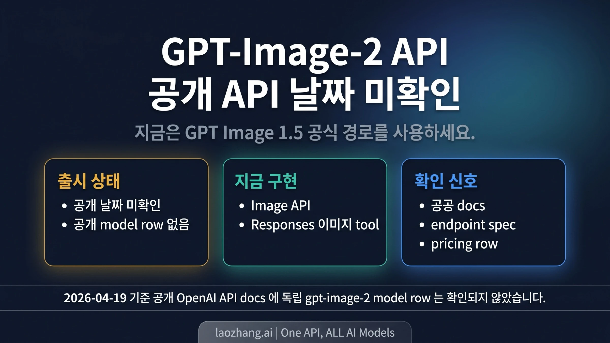 2026년 4월 19일 기준 OpenAI의 공식 공개 날짜는 확인되지 않았습니다. 개발자 문서, 모델 목록, endpoint, 가격표, 공식 안내를 확인해야 합니다.