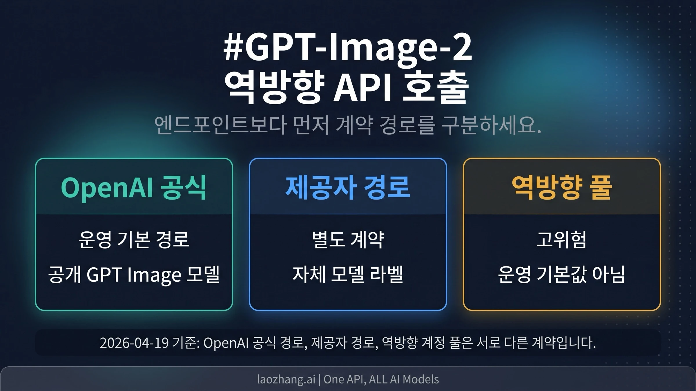 2026년 4월 19일 기준 OpenAI의 공개 이미지 API 자료에는 gpt-image-2 공개 모델 ID가 없습니다. 운영 환경에서는 먼저 OpenAI Images API, Edits API, Responses image generation tool과 공개 GPT Image 모델을 기준으로 삼아야 합니다. 제공자 gateway나 역방향 호환 endpoint는 별도 경로로 보고, 해당 제공자의 모델 라벨, 과금, 지원, 계정 리스크를 따로 평가해야 합니다.