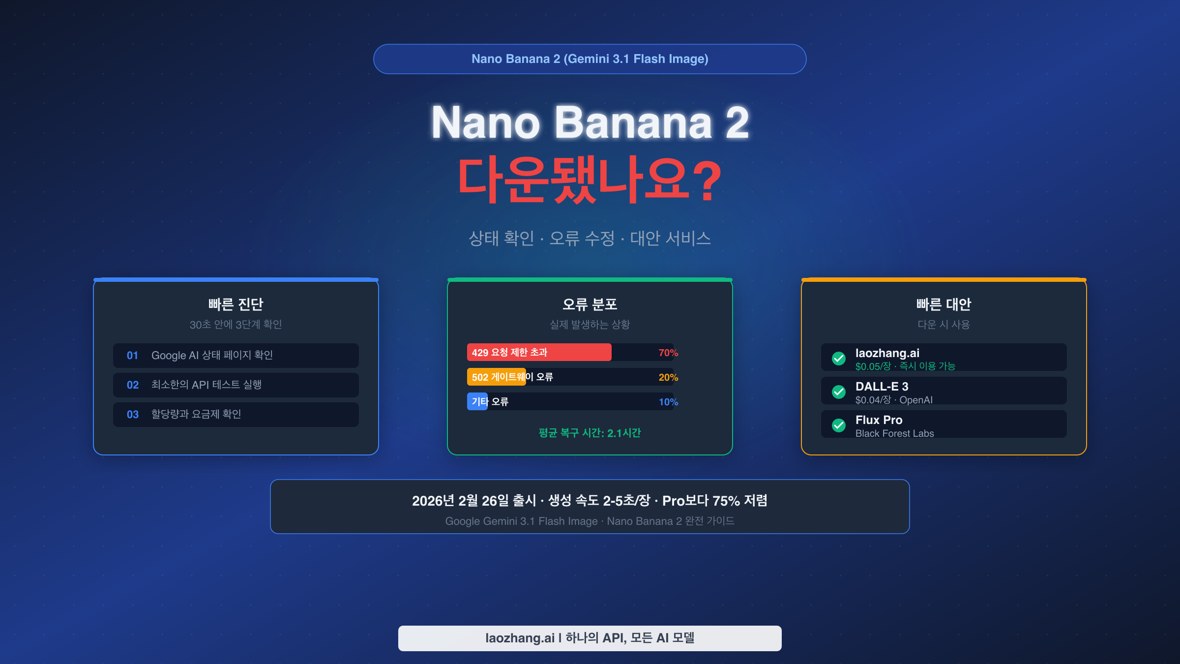 Nano Banana 2 다운 시 최고의 대안은? laozhang.ai($0.05/이미지, OpenAI 호환 API), DALL-E 3($0.04~$0.12/이미지), Fal.ai 또는 Replicate의 Flux Pro. 장애 발생 시가 아닌 미리 설정해 두세요.