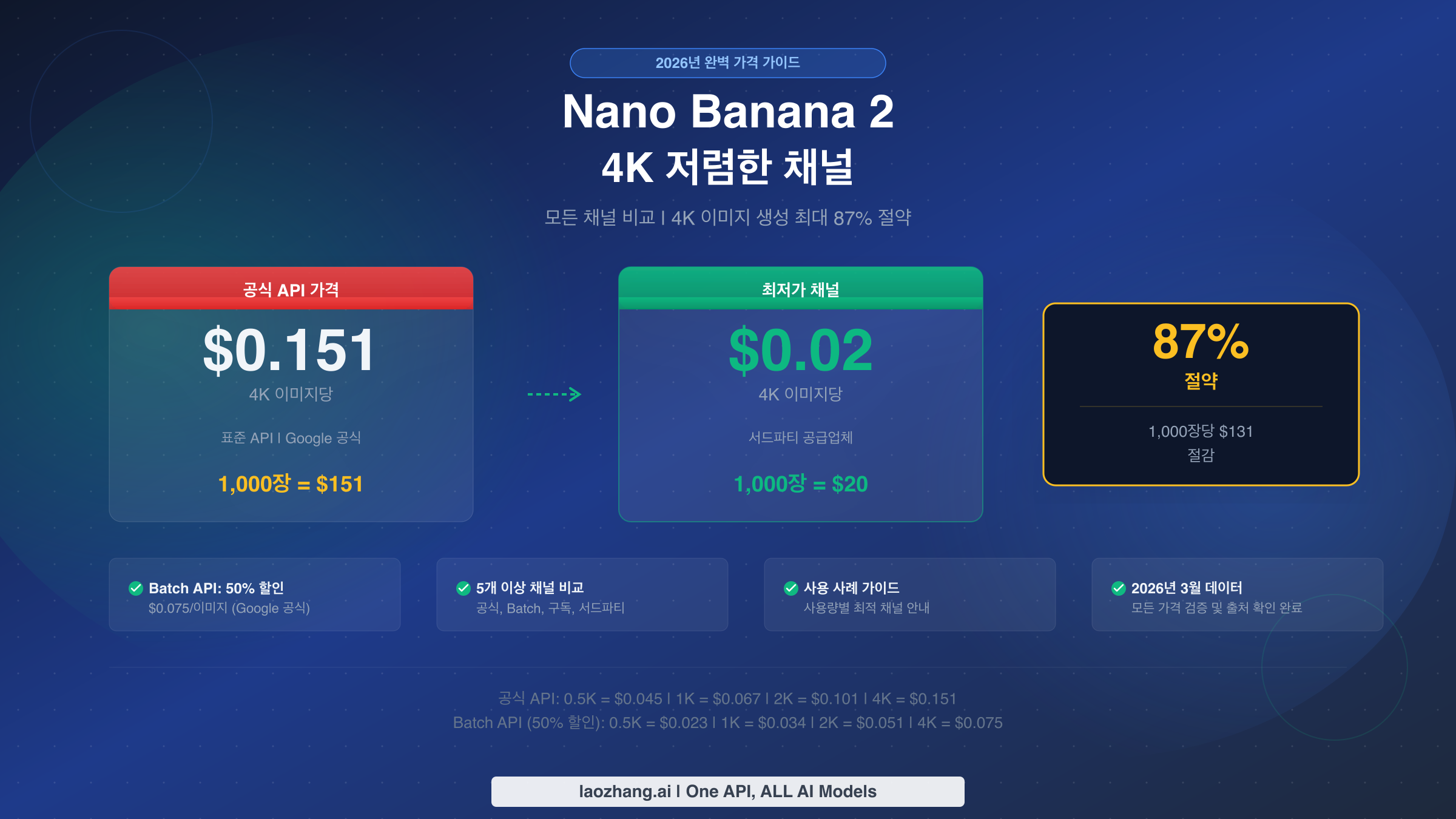 Nano Banana 2는 Google 공식 API를 통해 이미지당 $0.151에 놀라운 4K 이미지를 생성하지만, 정가를 지불할 필요는 없습니다. Batch API를 사용하면 이미지당 $0.075로 비용을 절반으로 줄일 수 있으며, 결과를 최대 24시간 기다릴 수 있는 분이라면 누구나 이용 가능한 간편한 50% 할인입니다. 서드파티 공급업체를 통하면 절약 효과가 더욱 커져서, laozhang.ai는 해상도에 관계없이 이미지당 $0.05의 정액 요금을 제공하고, 전문 서비스의 경우 4K 생성당 $0.02까지 낮출 수 있습니다. 이 가이드에서는 2026년 3월 기준 Google 무료 티어부터 가장 저렴한 서드파티 API까지 모든 채널을 비교하여, 여러분의 구체적인 사용량과 예산에 맞는 최적의 솔루션을 찾을 수 있도록 안내합니다.