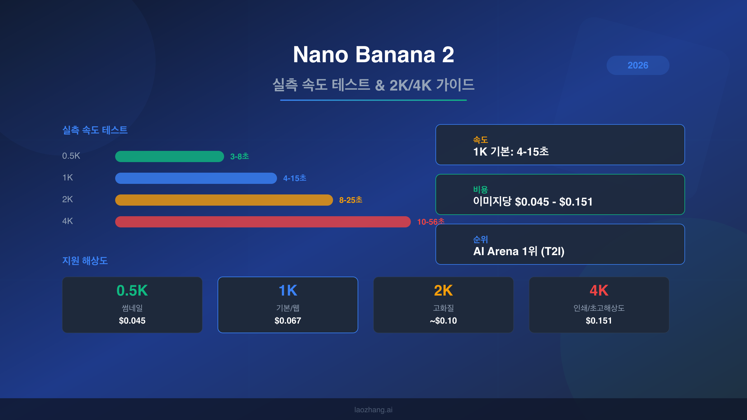 Nano Banana 2(gemini-3.1-flash-image-preview)는 2026년 3월 기준 실측에서 1K 해상도 4-15초, 4K 해상도 10-56초의 이미지 생성 속도를 기록했습니다. 해상도에 따라 이미지당 $0.045-$0.151의 비용으로, AI Arena 텍스트-이미지 생성 부문 1위를 차지하면서도 Nano Banana Pro 대비 약 절반의 비용만 부과됩니다. 이 가이드에서는 전 해상도에 걸친 실측 속도 벤치마크를 다루고, Google의 공식 마케팅 수치인 4-6초와 실제 생성 시간이 다를 수 있는 이유를 설명하며, 프로덕션용 코드와 함께 2K 및 4K 이미지 생성 과정을 단계별로 안내합니다.