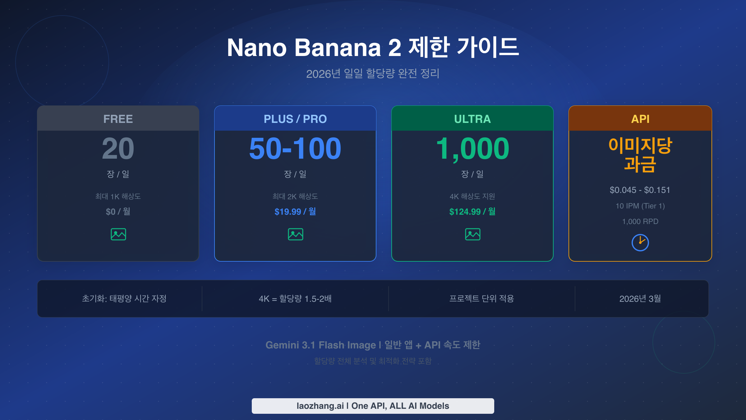 Nano Banana 2 — 공식 명칭 Gemini 3.1 Flash Image — 는 두 가지 완전히 독립된 트랙을 통해 엄격한 일일 할당량을 적용합니다. 무료 Gemini 앱 사용자는 1K 해상도 제한과 함께 하루 약 20장의 이미지를 생성할 수 있습니다. 유료 구독자는 등급에 따라 하루 501,000장을 생성할 수 있으며, 월 $19.99$124.99의 요금이 부과됩니다. API 개발자는 완전히 다른 제한 체계를 따르는데, 무료 등급에서는 이미지 생성이 아예 불가능하며 Tier 1(결제 활성화 필수)에서는 하루 1,000건의 요청과 분당 10장의 이미지 생성이 허용됩니다. 모든 할당량은 태평양 시간 자정에 초기화되며, 4K 이미지를 생성할 경우 표준 512px 출력 대비 최대 3.37배 더 많은 토큰이 소비됩니다.