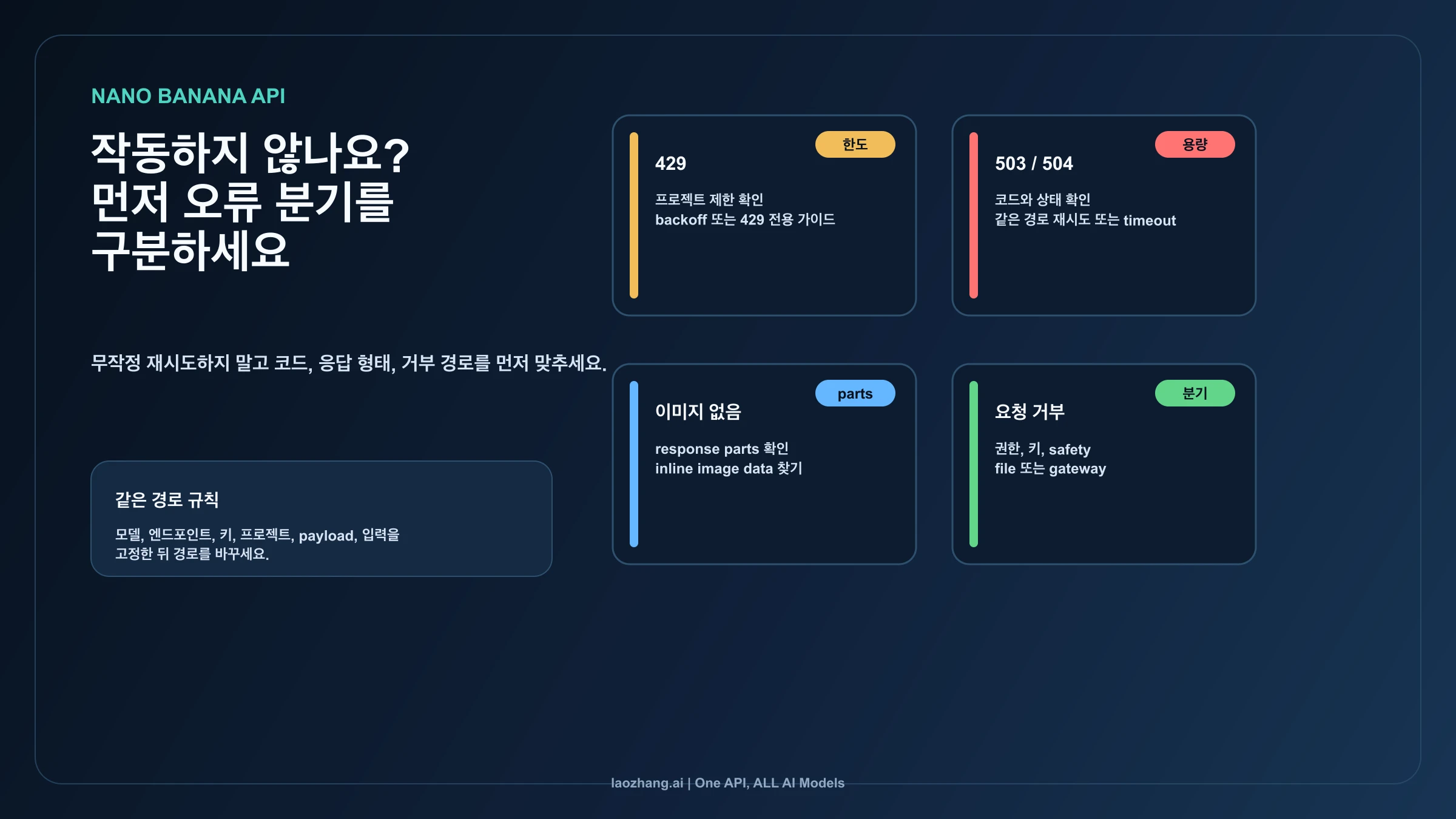 Nano Banana API가 실패하면 먼저 오류 분기를 정해야 합니다. 429 RESOURCE_EXHAUSTED는 프로젝트나 모델의 한도 압박입니다. 503 UNAVAILABLE은 용량 또는 일시적 가용성 문제입니다. 504 DEADLINE_EXCEEDED는 timeout 분기입니다. HTTP 성공인데 이미지가 없으면 response parts, inlineData, output modality, safety finish, file reference를 확인해야 합니다. 요청 거부 문구는 permission, safety, key/project, file access, gateway policy로 나누어야 합니다.