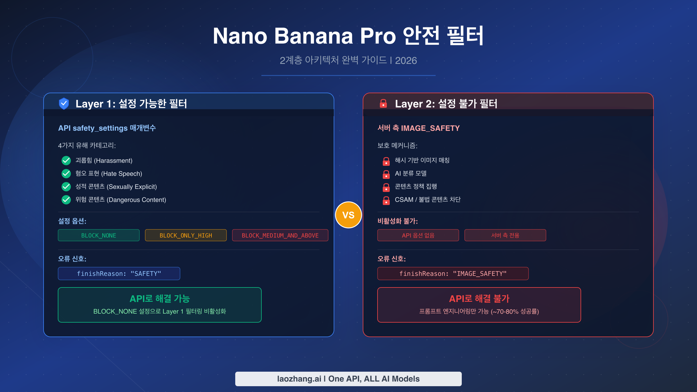 Nano Banana Pro의 안전 필터는 대부분의 개발자가 혼동하는 두 개의 독립적인 계층에서 작동하며, 이로 인해 잘못된 해결책을 적용하느라 수 시간을 낭비하게 됩니다. Layer 1은 네 가지 유해 카테고리(괴롭힘, 혐오 표현, 성적 콘텐츠, 위험 콘텐츠)를 필터링하며, API 호출에서 safety_settings를 BLOCK_NONE으로 설정하면 완전히 비활성화할 수 있습니다. Layer 1이 요청을 차단하면 응답에 finishReason: "SAFETY"가 표시됩니다. Layer 2는 생성된 이미지를 AI 분류, 해시 매칭, 정책 집행을 통해 스캔하는 IMAGE_SAFETY라는 완전히 별도의 서버 측 시스템입니다. Layer 2가 차단하면 응답에 finishReason: "IMAGE_SAFETY"가 표시되며, 어떤 API 설정으로도 이를 비활성화할 수 없습니다. Layer 2에 대한 최선의 선택지는 프롬프트 엔지니어링(경계선 콘텐츠에서 약 70-80% 성공률)이거나, laozhang.ai와 같이 Layer 1 기본값이 완화된 플랫폼으로 전환하는 것입니다. CSAM, 극단적 폭력, 노골적 포르노그래피 등 영구 금지 카테고리에 해당하는 콘텐츠는 어떤 합법적 플랫폼이나 기법으로도 생성할 수 없습니다.