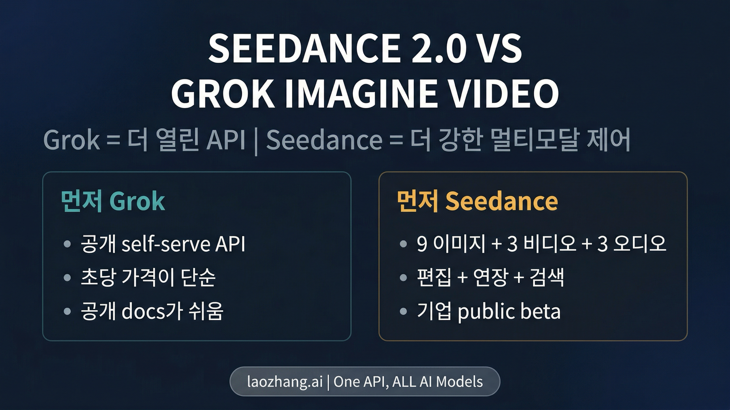 지금 바로 쓰기 쉬운 공개 영상 API가 필요하다면 Grok Imagine Video부터 시작하는 편이 맞다. 여러 이미지 참조, 비디오 참조, 오디오 참조를 한 공식 워크플로 안에서 함께 쓰고, 편집이나 연장까지 포함한 더 무거운 멀티모달 제어가 필요하다면 Seedance 2.0부터 보는 편이 맞다.