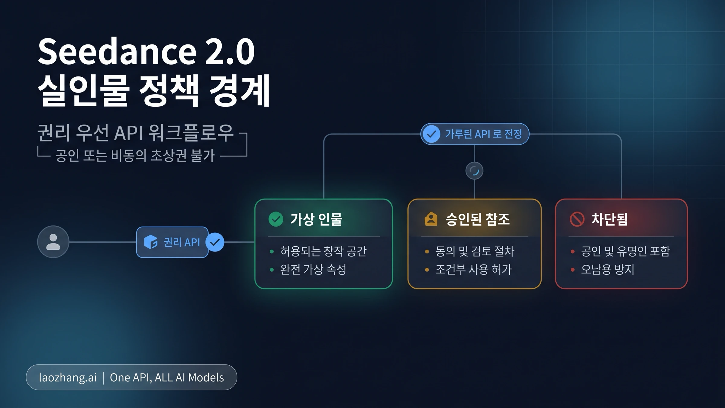 2026년 4월 20일 기준 Seedance 2.0 API 경로는 사람이 등장하는 영상을 만들고 이미지, 영상, 오디오 참조를 사용할 수 있습니다. 하지만 실제 인물이나 유명인의 초상을 제한 없이 재현하는 API로 다루면 안 됩니다. 대상이 식별 가능한 실제 인물이라면 조건부로 판단해야 합니다. 허구 인물은 보통 창작 작업이고, 승인된 실제 인물 참조는 권리와 동의 워크플로가 필요하며, 공인, 사칭, 성적 또는 명예훼손 출력, 무단 likeness는 API 호출 전에 차단해야 합니다.