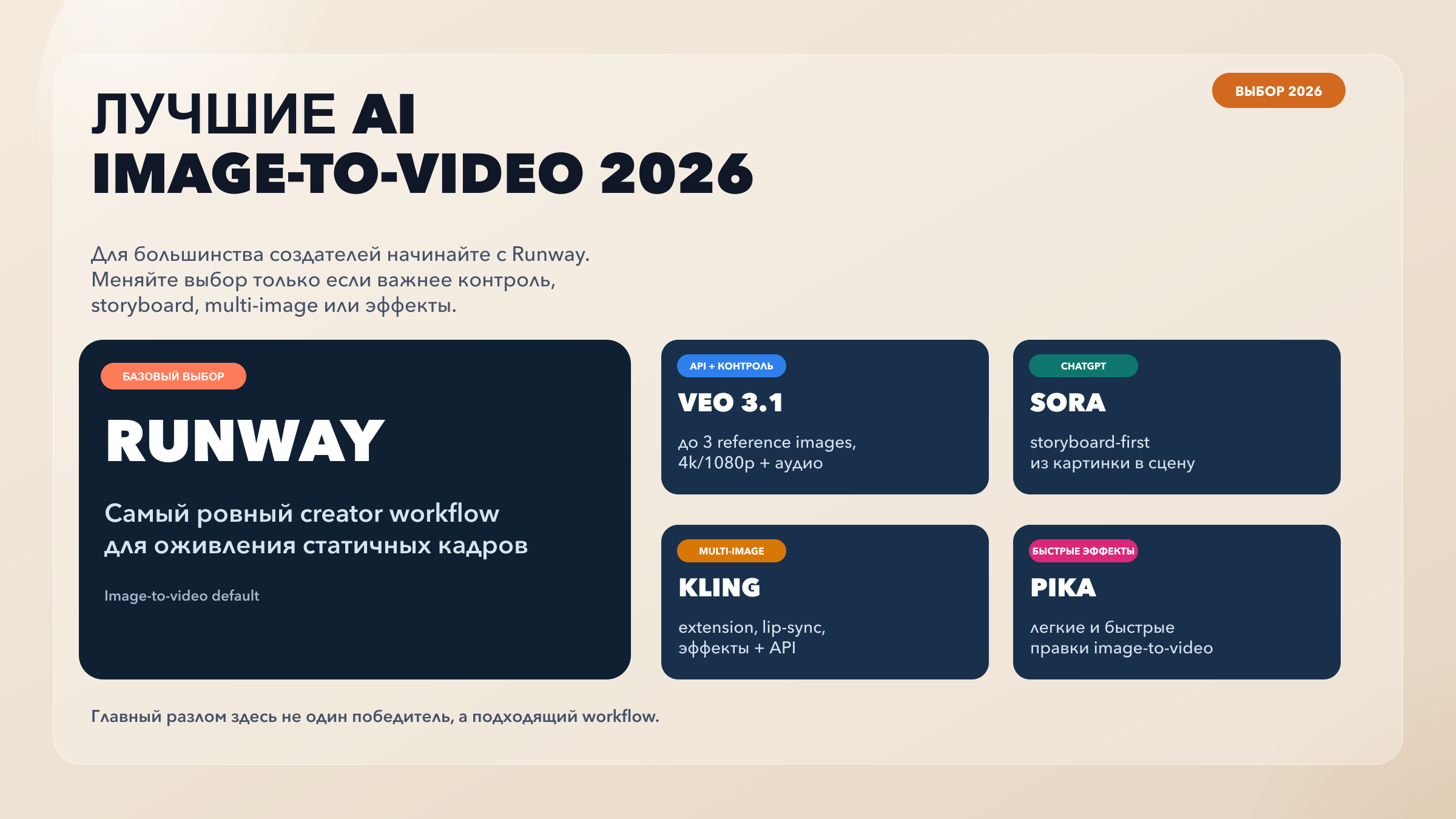 Если в 2026 году вам нужен один AI image-to-video инструмент, с которого имеет смысл начинать, начните с Runway. Для большинства создателей это самый ровный выбор по умолчанию: не нужно сразу думать как API-покупатель, не нужно заранее принимать регионально ограниченный app-flow, и не нужно стартовать в продукте, который прежде всего заточен под эффекты или развлекательные сценарии. Когда задача действительно другая, тогда уже и стоит переключаться. Логика переключения простая: Veo 3.1 нужен для API-уровня, строгого контроля референсов и нативного аудио; Sora лучше подходит тем, кто и так живет внутри ChatGPT и хочет storyboard-first workflow; Kling нужен, когда важны multi-image motion, extension, lip-sync и эффекты; Pika логичнее брать, когда нужен легкий, быстрый, более игровой image-to-video sandbox.