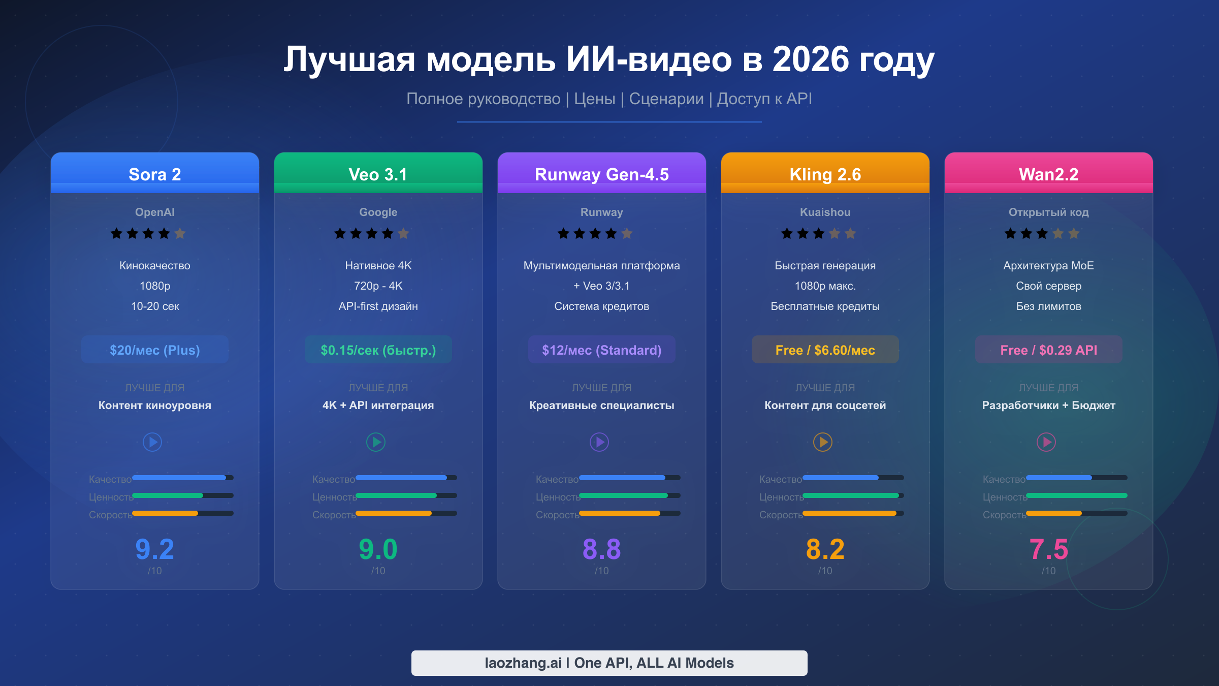 | Модель | Качество (10) | Ценность (10) | Скорость (10) | API-доступ | Поддержка 4K |