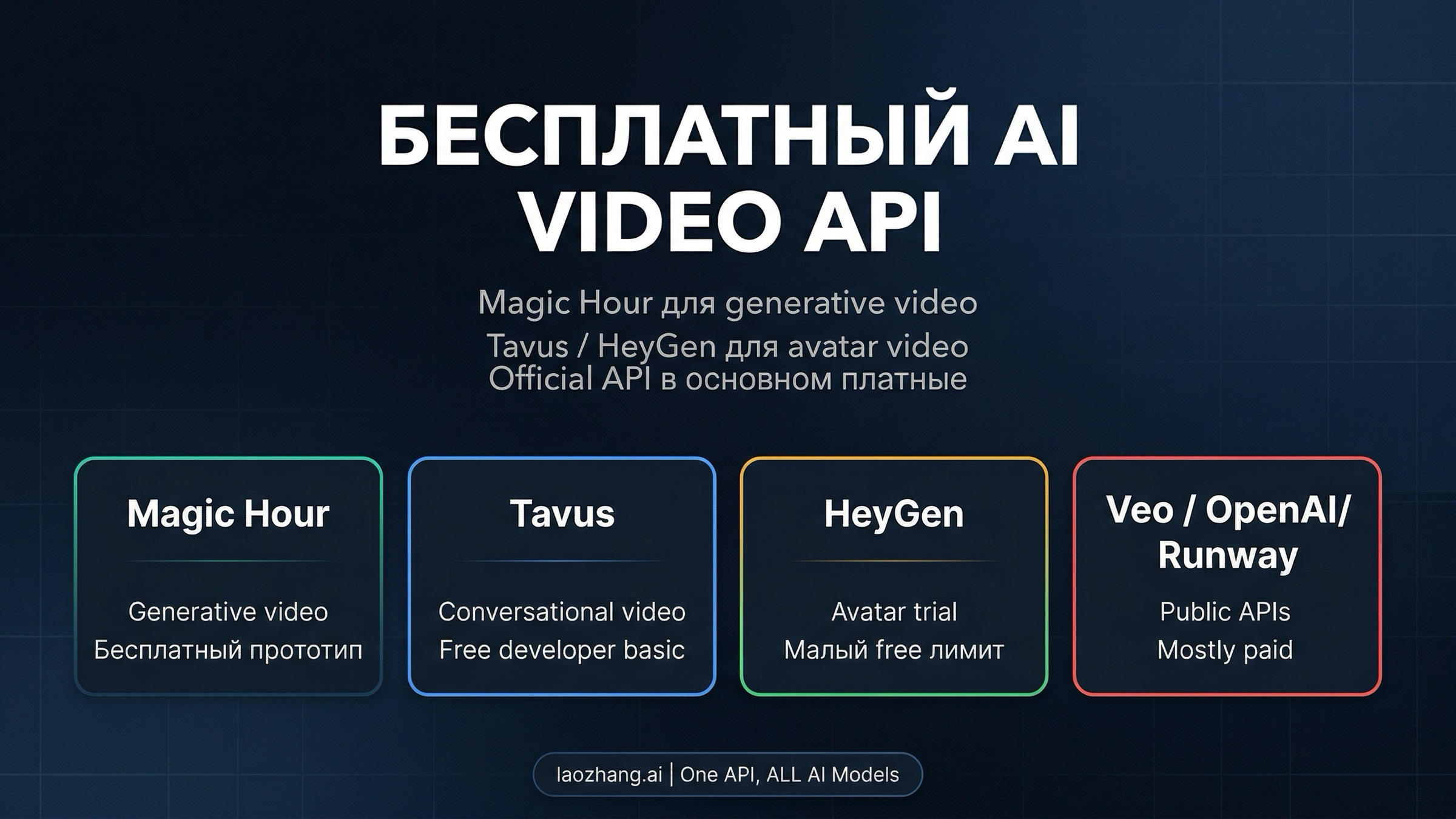 Если вам нужен один бесплатный AI Video API для реального text-to-video или image-to-video prototyping, начните с Magic Hour. Если ваша задача это avatar video, digital humans или conversational video, логичнее сначала открыть Tavus, а HeyGen оставить как более легкий и маленький trial. Если же в голове у вас прежде всего Google's Veo, OpenAI video surface или public API Runway, честный ответ такой: эти официальные developer surfaces в основном платные.