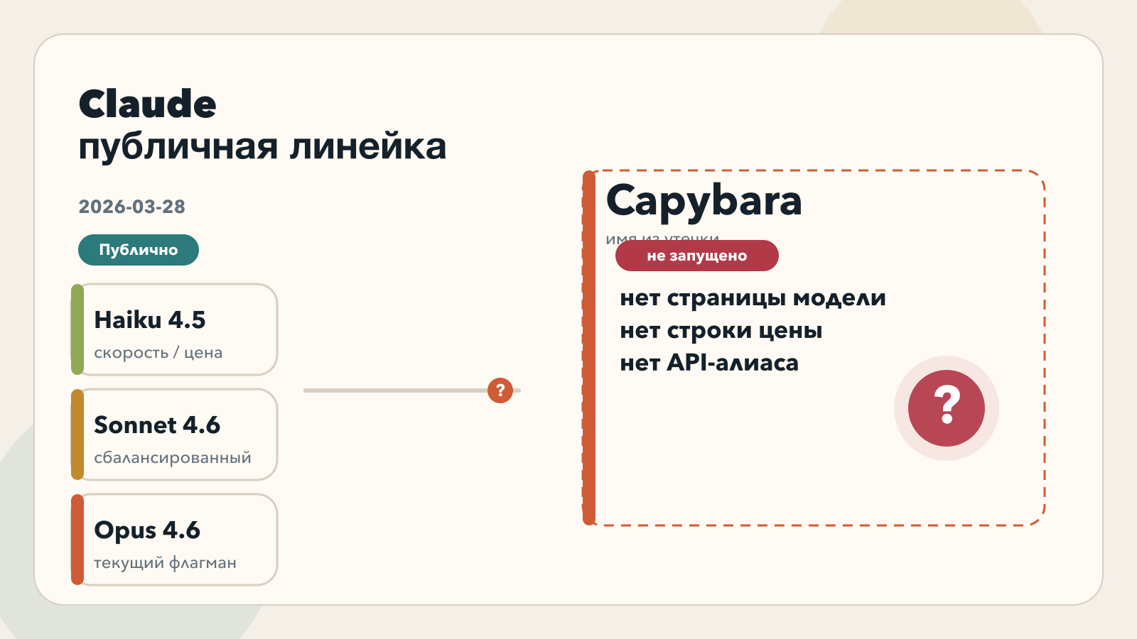 Третий уровень самый скользкий. В том же материале Fortune говорится, что в черновиках фигурировали имена Claude Mythos и Capybara, а Capybara описывался как новый уровень выше Opus. Это важный сигнал о возможном позиционировании, но пока еще не публичный продуктовый контракт. Черновик показывает направление. Он не дает пользователю того, что делает модель реальной для работы: официальной страницы, цены, alias, даты релиза и условий доступа.