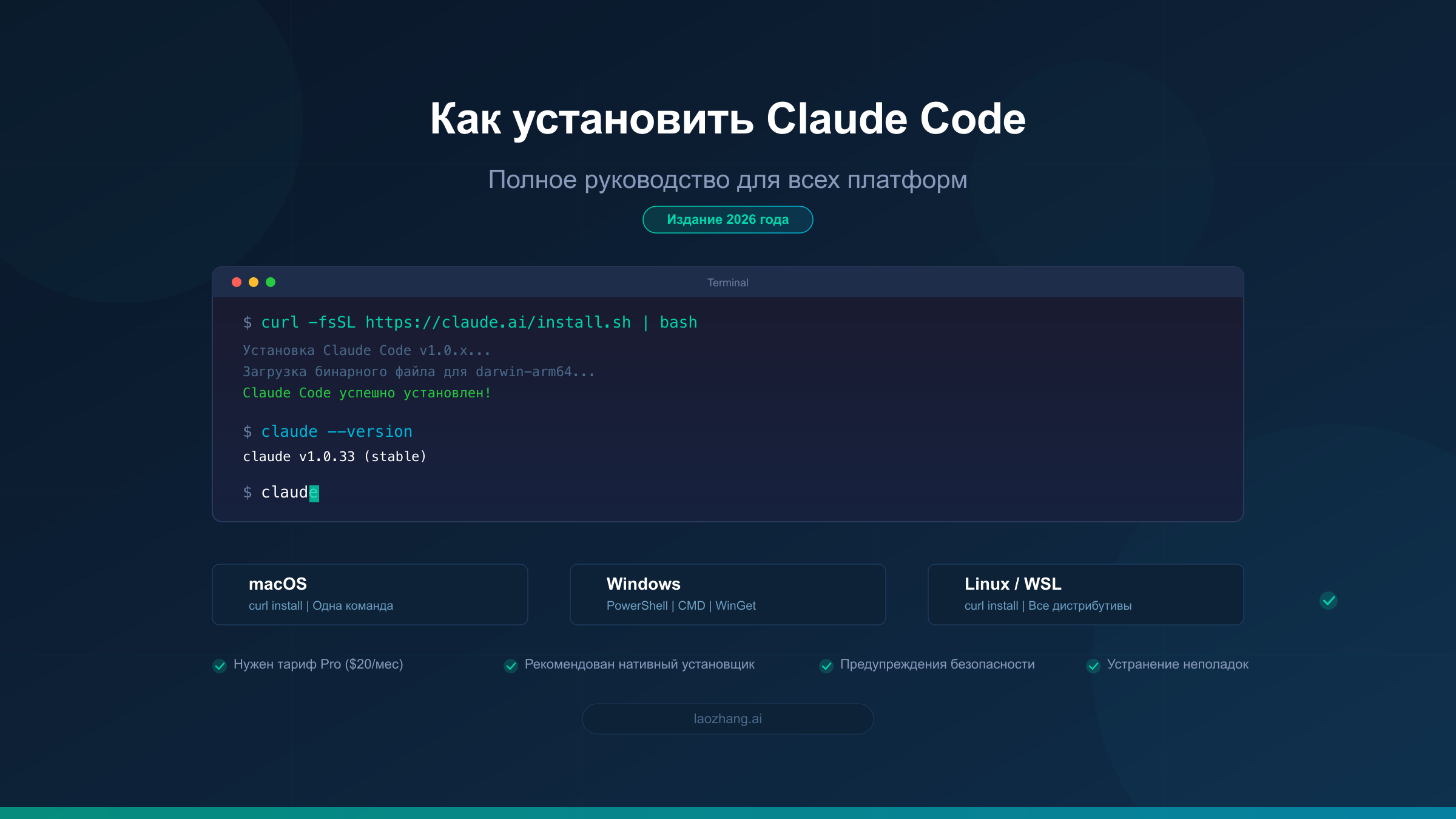 Claude Code — это официальный интерфейс командной строки от Anthropic, который привносит ИИ-помощь в программировании прямо в ваш терминал. В отличие от браузерных инструментов, он читает всю кодовую базу целиком, выполняет команды и обрабатывает сложные многофайловые правки через естественный язык — и всё это без выхода из командной строки. По состоянию на март 2026 года рекомендуемый способ установки — нативный установщик, который не требует зависимостей и обновляется автоматически. Для аутентификации и использования Claude Code вам потребуется как минимум подписка Claude Pro ($20/месяц), поскольку бесплатный тариф не включает доступ к CLI.