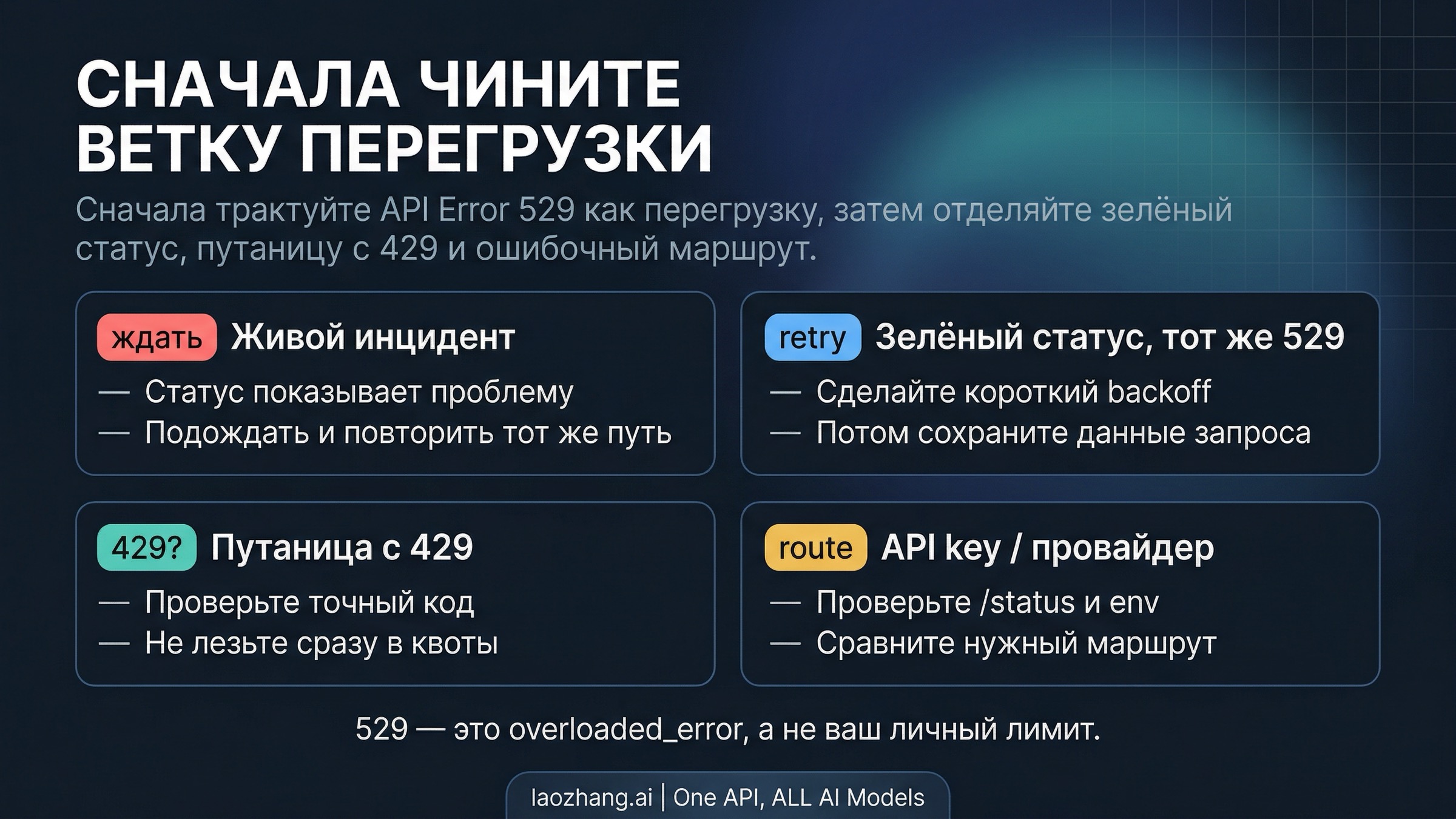 | Status зеленый, но тот же path все равно дает 529 | Временная или локализованная перегрузка | Сделать один bounded same-path retry с короткой паузой | Убедиться, восстановился ли именно тот path без лишних изменений | Несколько коротких retry на том же path все еще заканчиваются 529 |