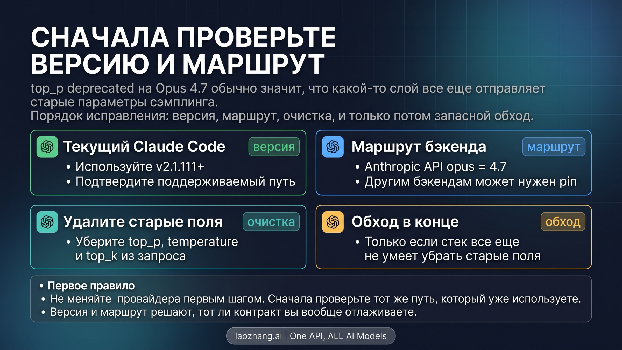 Если Claude Code показывает top_p deprecated на Opus 4.7, относитесь к этому как к mismatch между текущим request contract и вашим path, а не как к приглашению сразу менять provider. Сначала версия, затем route, затем удаление старых полей, потом same-path verification, и только после этого — временный fallback, если стек по-прежнему не умеет остановиться.