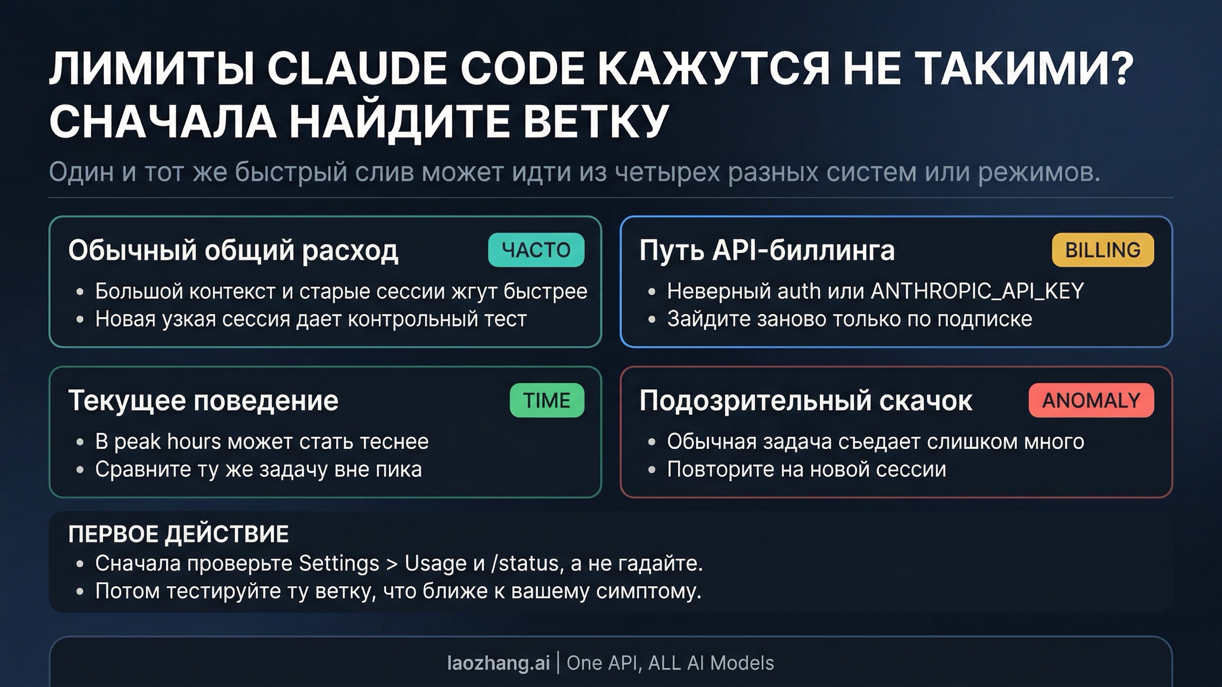 Если лимиты Claude Code ведут себя странно, первый вопрос не "какая у меня точная квота?", а "какую систему учета я сейчас вообще задеваю?". Большинство жалоб вида "почему все закончилось так рано" в итоге сводятся к одной из четырех веток: обычный быстрый расход общего плана в тяжелой сессии, случайный уход в API-биллинг, более жесткое поведение в пиковые часы или подозрительный скачок, который уже стоит эскалировать.
