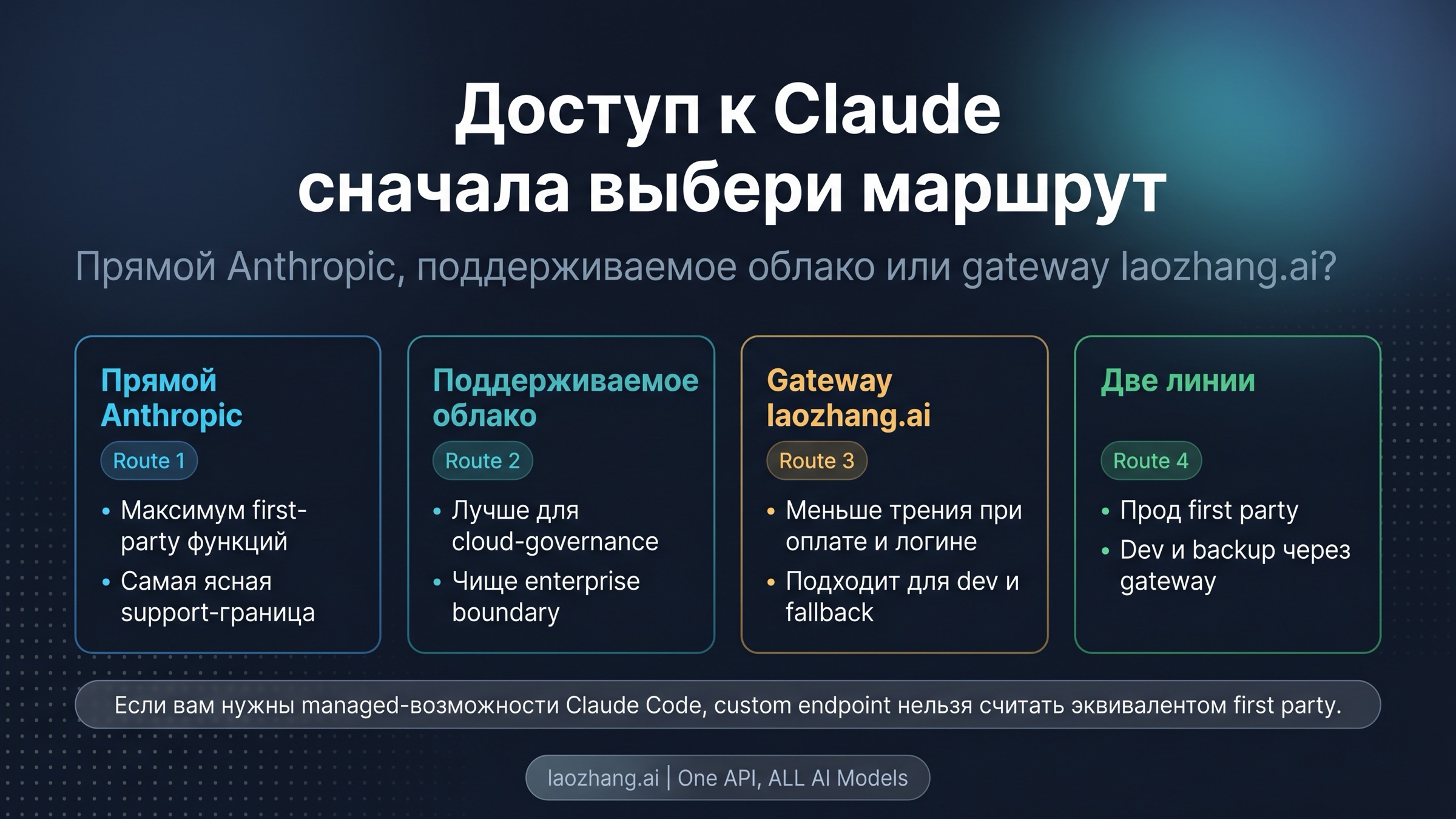 Для Claude и Claude Code прямой Anthropic, поддерживаемое облако и совместимый шлюз вроде laozhang.ai — это не три бренда внутри одного рейтинга. Это разные способы подключения с разными границами и разными компромиссами.