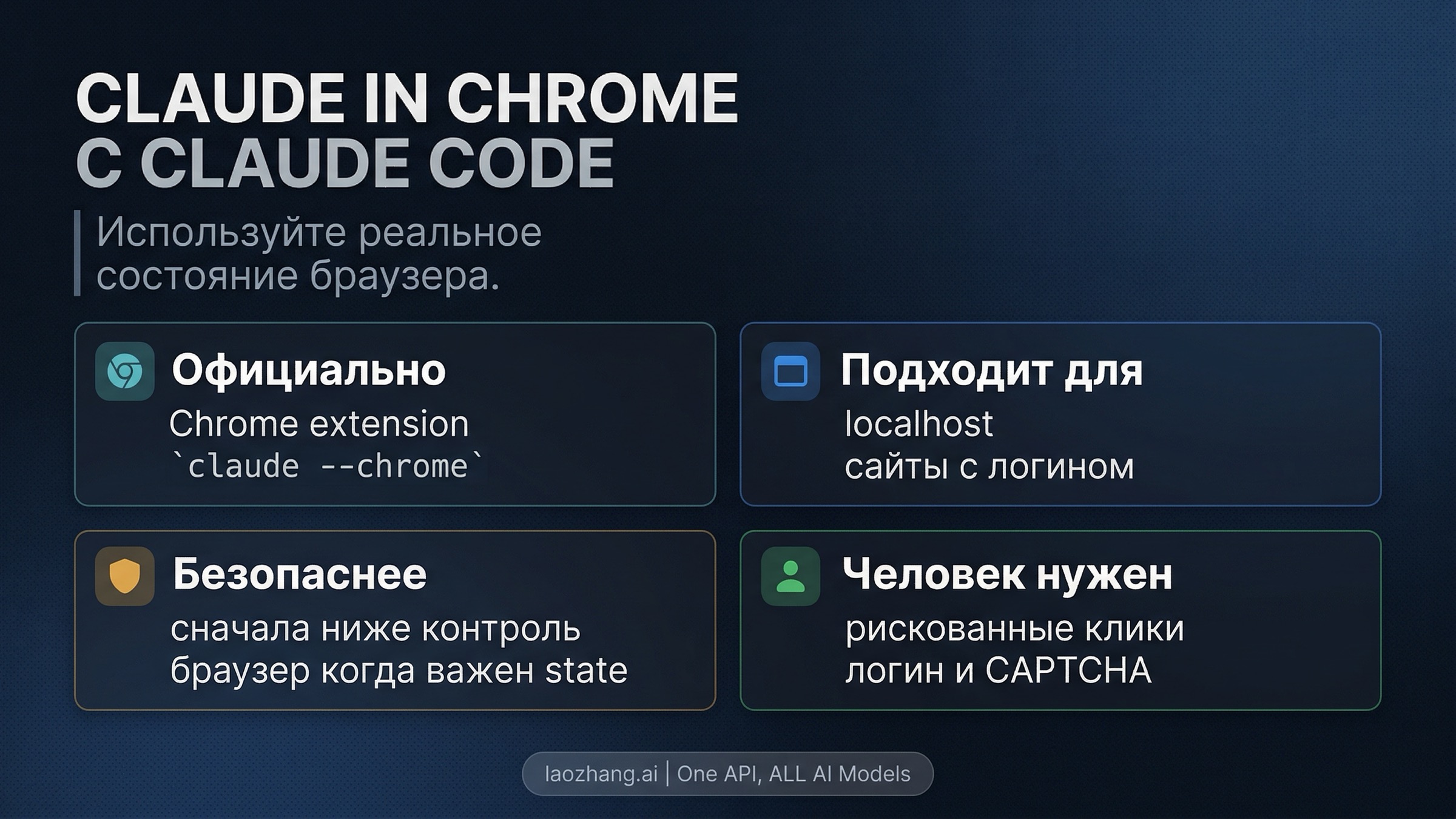 Если вы хотите, чтобы Claude Code работал прямо в вашем браузере, нужная функция называется Claude in Chrome. Установите официальное расширение, держите окно Chrome открытым и видимым, а затем запускайте Claude Code через claude --chrome или подключайтесь внутри живой сессии командой /chrome. Ценность маршрута не в том, что «Claude теперь умеет кликать». Ценность в том, что Claude Code получает доступ к вашему реальному браузеру с уже существующим логином, а это как раз и важно для localhost, внутренних панелей и страниц за авторизацией.