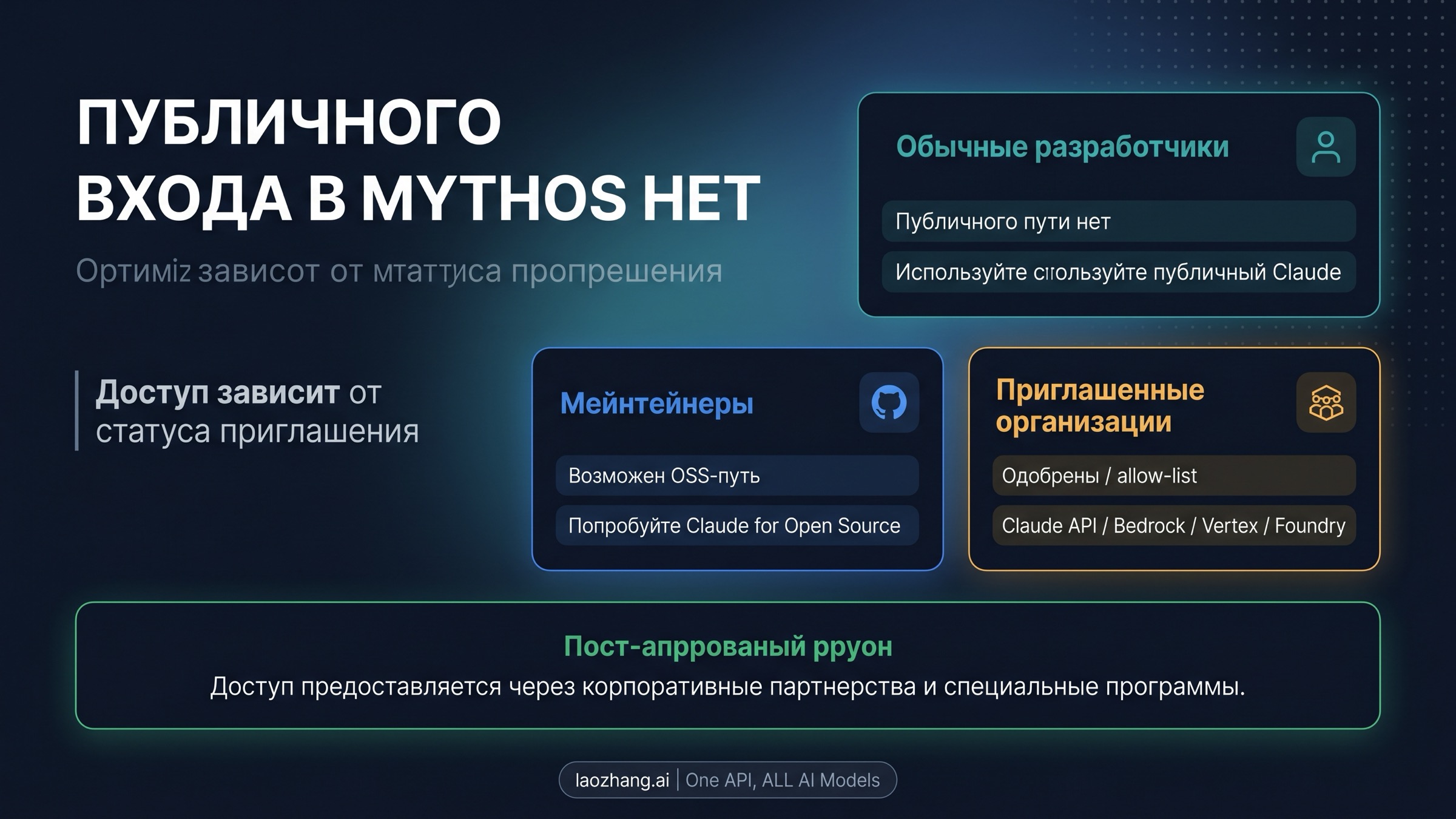 | Обычный разработчик, команда или стартап вне приглашенного круга | Публичного пути нет | Сейчас нет ни публичного signup, ни открытого waitlist, ни обычного dashboard toggle для Mythos. |