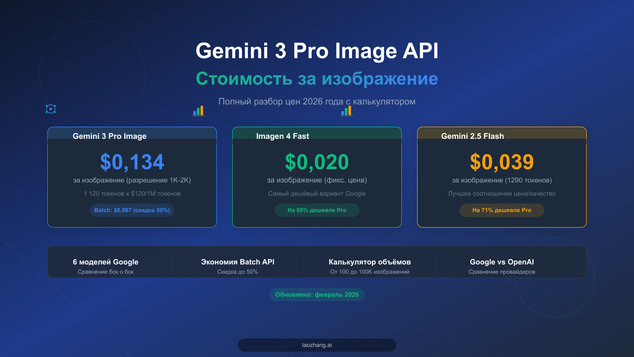 Генерация изображений через Gemini 3 Pro Image API обходится ровно в $0,134 за изображение при стандартном разрешении 1K-2K и $0,24 за изображение в 4K, согласно токенной модели ценообразования Google, где выходные токены изображений тарифицируются по $120 за миллион токенов (ai.google.dev, февраль 2026). Самый доступный вариант генерации изображений от Google — Imagen 4 Fast, всего $0,02 за изображение, а Batch API предлагает скидку 50% на любую модель, снижая стоимость Gemini 3 Pro до $0,067 за изображение. Если вы сравниваете с конкурентами, GPT Image 1 Low начинается от $0,011 за изображение, хотя качество заметно отличается. В этом руководстве подробно разбирается токенная математика, сравниваются все шесть моделей генерации изображений Google и три основных конкурента, а также приводятся готовые месячные прогнозы затрат от 100 до 100 000 изображений.