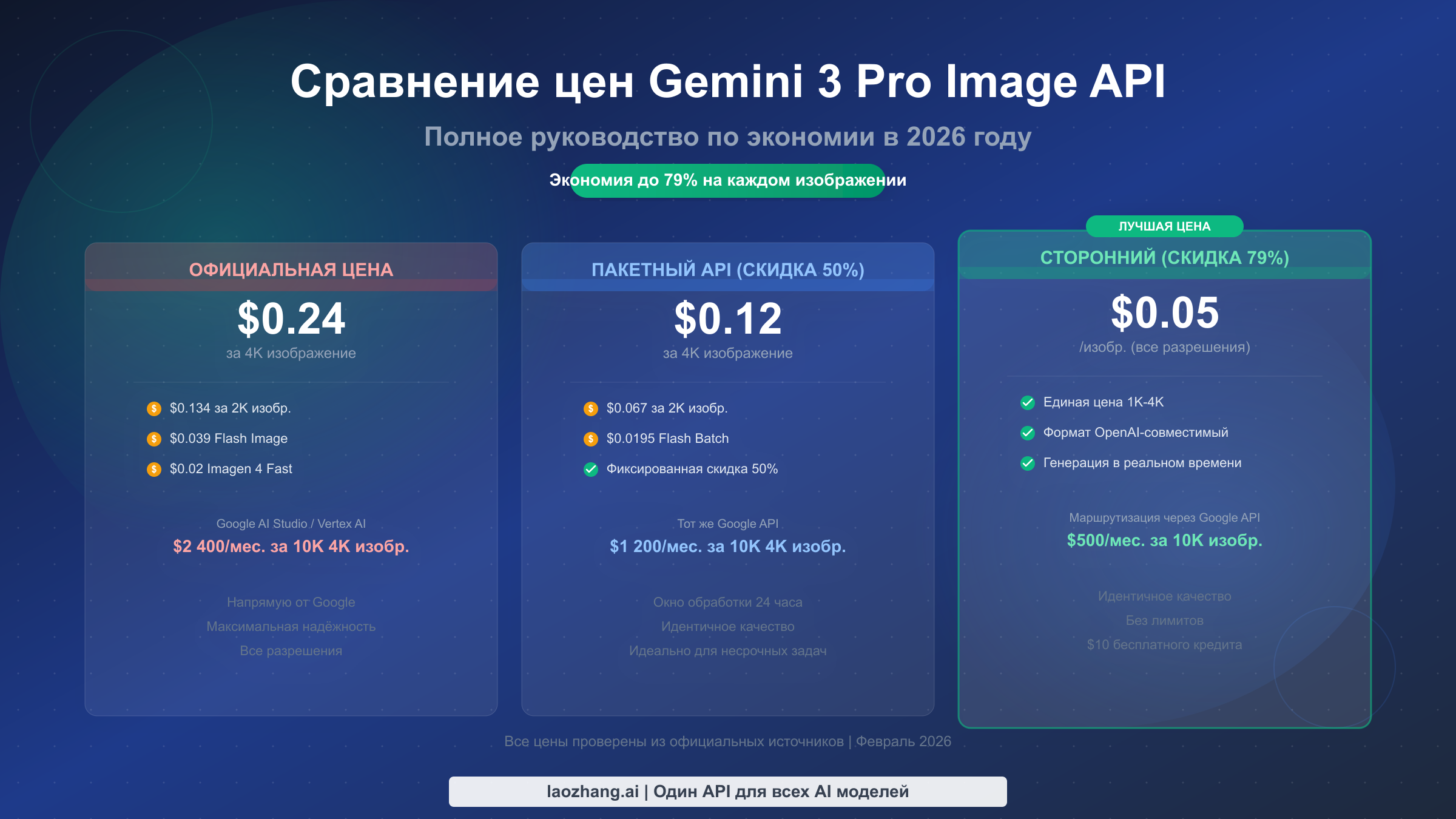 Доступ к API Gemini 3 Pro Image (Nano Banana Pro) от Google вовсе не обязан обходиться в $0,24 за каждое изображение. По состоянию на февраль 2026 года разработчики могут генерировать изображения идентичного качества всего за $0,02 с помощью Imagen 4 Fast от Google, за $0,05 через сторонних провайдеров вроде laozhang.ai или за $0,067 через собственный Batch API Google — экономия достигает 92% по сравнению со стандартной ценой Gemini 3 Pro. В этом руководстве мы подробно разбираем каждый ценовой уровень, сравниваем все доступные варианты и показываем, какой подход лучше всего подходит именно для вашего сценария использования.