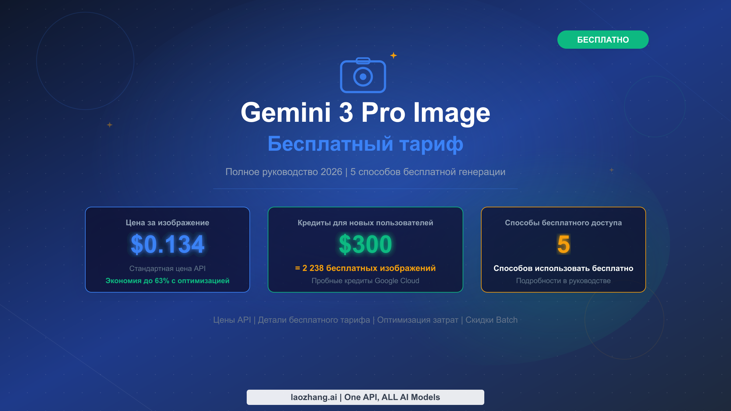 У Gemini 3 Pro Image (gemini-3-pro-image-preview, также известного как Nano Banana Pro) нет бесплатного API тарифа по состоянию на февраль 2026 года. Стандартная цена составляет $0,134 за изображение в разрешении 1K-2K и $0,24 за изображение в разрешении 4K (официальные цены Google AI, февраль 2026). Однако пять практических альтернатив позволяют использовать модель бесплатно или почти бесплатно: $300 кредитов для новых пользователей Google покрывают 2 238 стандартных изображений, веб-интерфейс AI Studio предлагает 2-3 бесплатные генерации ежедневно, модель Gemini 2.5 Flash Image предоставляет полноценный бесплатный API тариф с генерацией до 500 изображений в день, подписка Google AI Pro за $19,99/месяц включает бесплатный пробный месяц, а сторонние API-прокси предлагают тарифы от $0,05 за изображение. Для большинства пользователей модель Flash Image по $0,039 за изображение — или полностью бесплатно через бесплатный API тариф — справится с 80% задач по генерации изображений без обращения к ценам Pro.