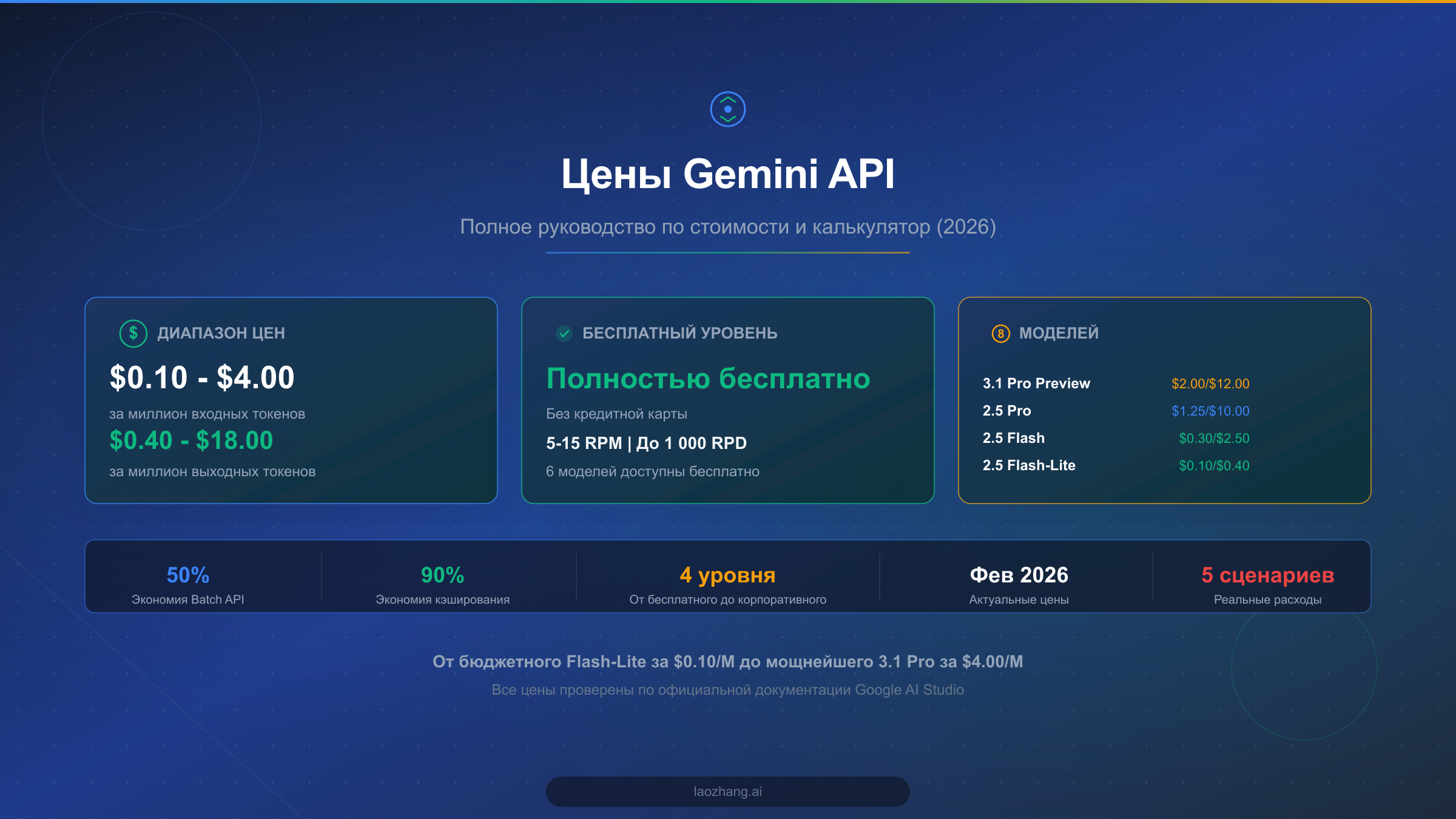 Стоимость Gemini API составляет от $0.075 до $4.00 за миллион входных токенов и от $0.30 до $18.00 за миллион выходных, в зависимости от модели и длины контекста. Самый доступный вариант -- Gemini 2.0 Flash-Lite по $0.075/$0.30, тогда как самая мощная Gemini 3.1 Pro Preview стоит $2.00/$12.00 для стандартного контекста и $4.00/$18.00 для контекстов свыше 200K токенов (ai.google.dev, февраль 2026).