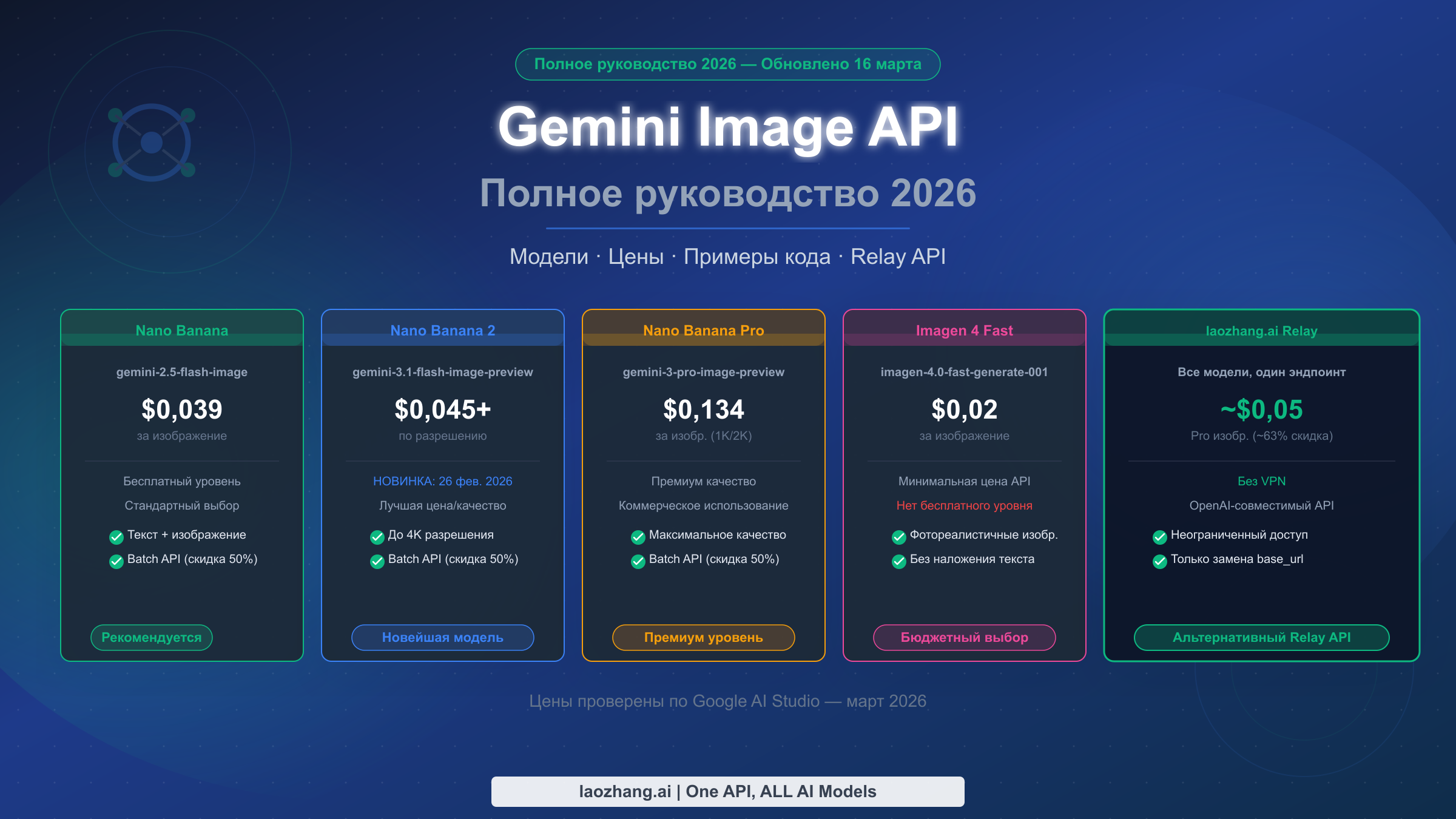 Gemini Image API открывает разработчикам доступ к пяти моделям генерации изображений в 2026 году: Nano Banana (gemini-2.5-flash-image, от $0,039/изображение), Nano Banana 2 (gemini-3.1-flash-image-preview, запущен 26 февраля 2026 г., от $0,045/изображение при разрешении 1K), Nano Banana Pro (gemini-3-pro-image-preview, $0,134/изображение) и Imagen 4 в трёх уровнях стоимостью от $0,02 до $0,06 за изображение. Google AI Studio предоставляет бесплатный уровень примерно из 500 запросов в день для личного использования. Для разработчиков в регионах, где Google API недоступен напрямую, или тех, кто ищет более низкую стоимость, relay-решения наподобие laozhang.ai обеспечивают полную совместимость с официальным API при сниженных ценах. Это руководство охватывает всё необходимое для интеграции Gemini Image API в ваше приложение в 2026 году: выбор модели, пошаговую настройку, рабочий код на трёх языках, полный прайс и relay-варианты.