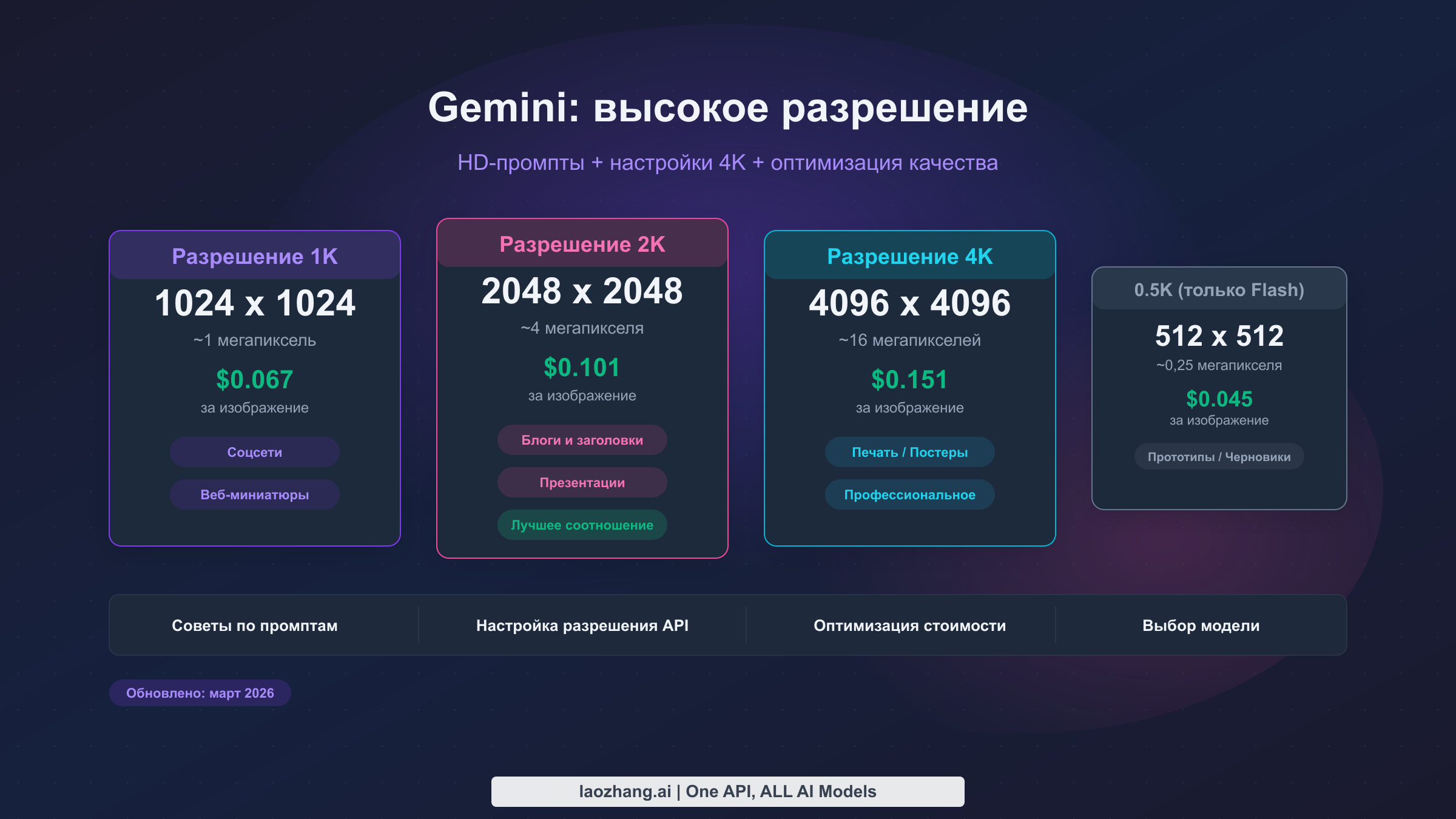Сколько стоит генерация изображений 4K? Через официальный Gemini API (по данным на март 2026 года) одно изображение 4K стоит примерно $0,151, исходя из 2 520 выходных токенов по $60 за миллион токенов. Для сравнения: 1K стоит $0,067, 2K — $0,101, а 0.5K — $0,045. Batch API предлагает 50% скидку на все разрешения для несрочных задач. Сторонние провайдеры API могут предлагать иные тарифы — например, laozhang.ai берёт фиксированную плату $0,05 за изображение независимо от разрешения.