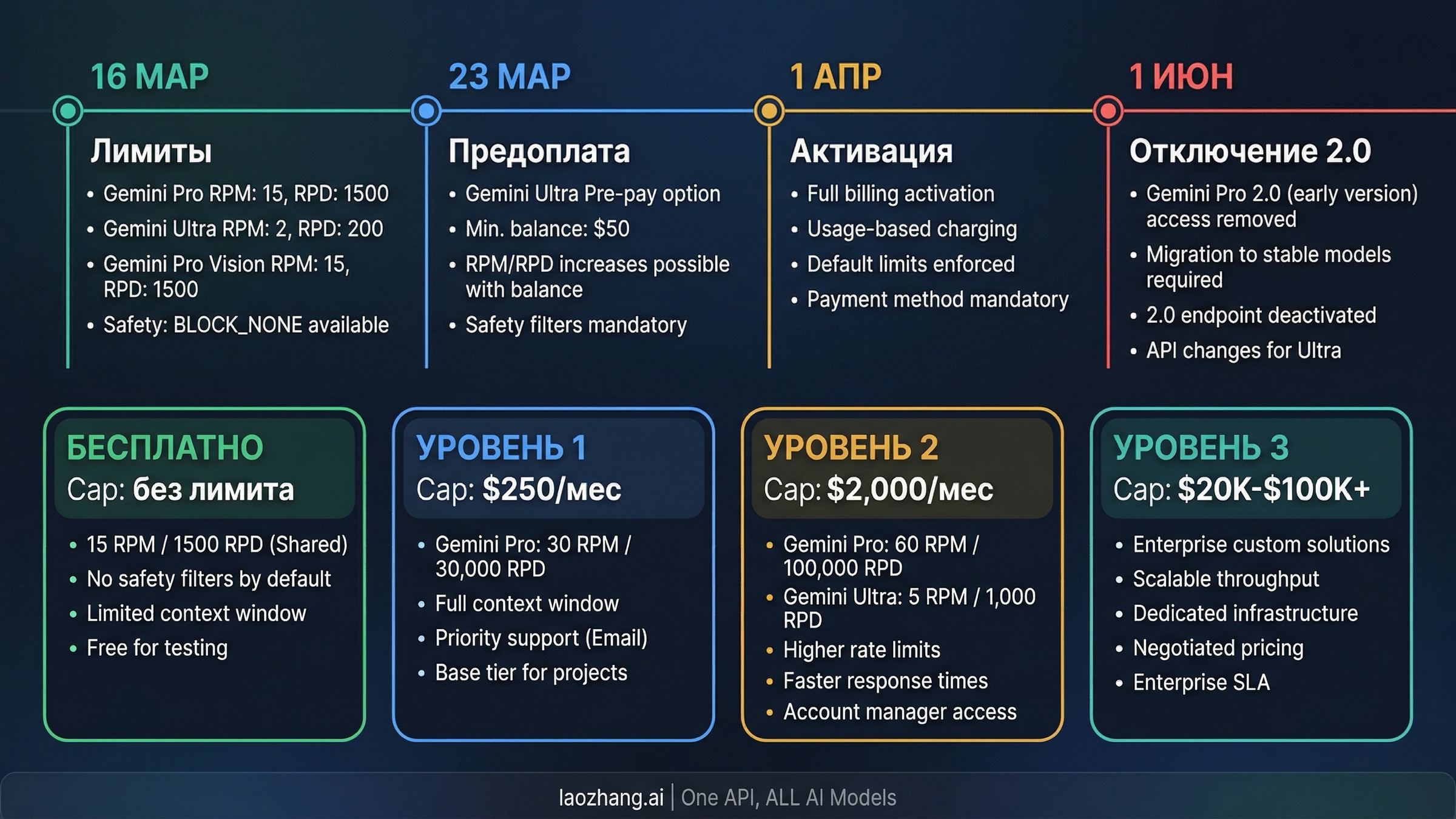 1 апреля 2026 — самая значимая дата. Именно тогда Google начинает принудительно применять максимальные месячные лимиты расходов на уровне платёжного аккаунта для каждого тарифного уровня. В отличие от опциональных лимитов на уровне проектов, эти тарифные лимиты являются обязательными и не могут быть отключены. Если ваши совокупные расходы по всем проектам, привязанным к платёжному аккаунту, достигнут лимита вашего тарифа, все запросы к Gemini API, связанные с этим аккаунтом, будут приостановлены до начала следующего биллингового цикла (ai.google.dev/docs/billing, март 2026).