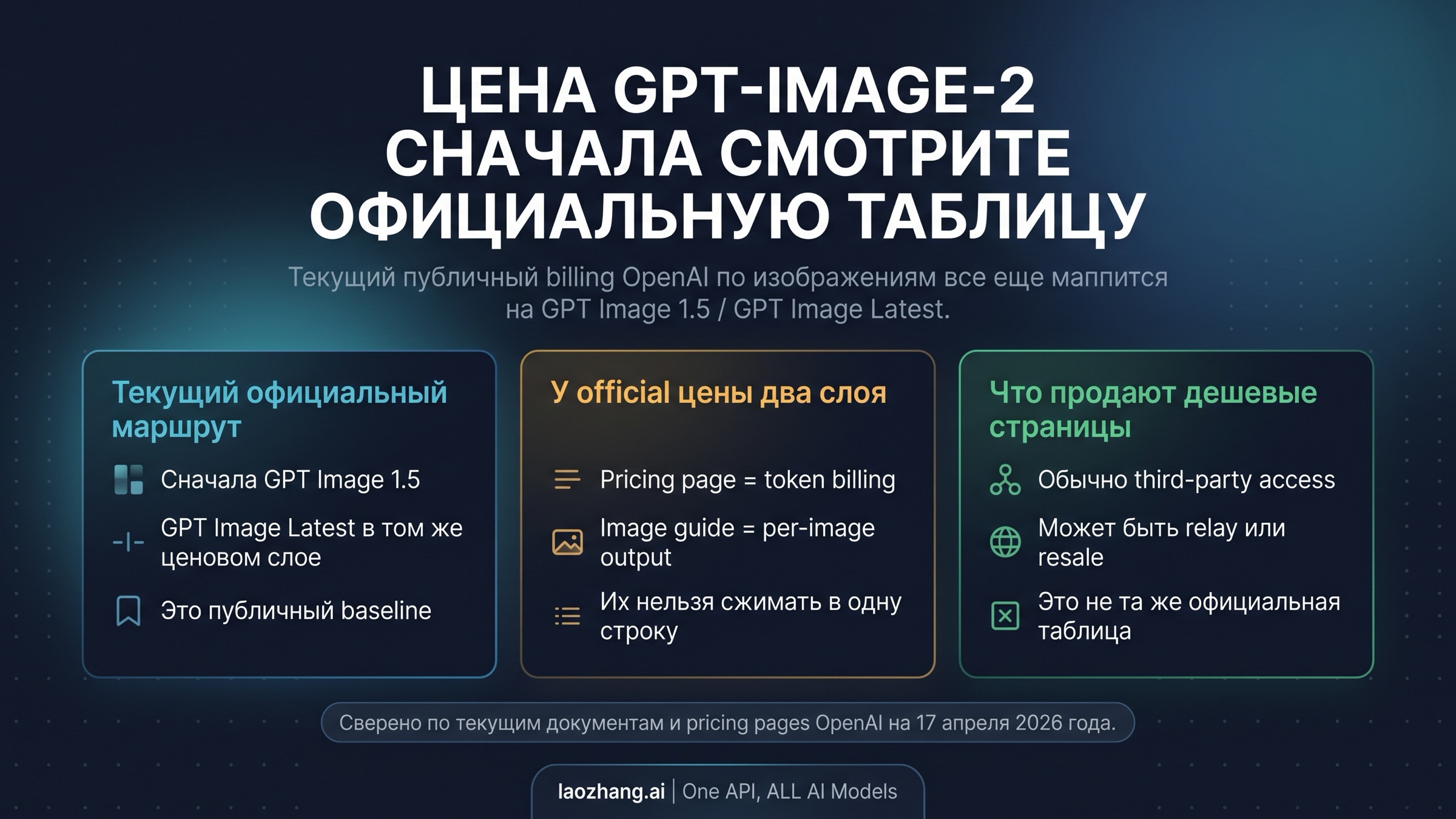 | Почему официальная цена выглядит не как одно число? | Потому что OpenAI одновременно показывает token billing и per-image output pricing. |