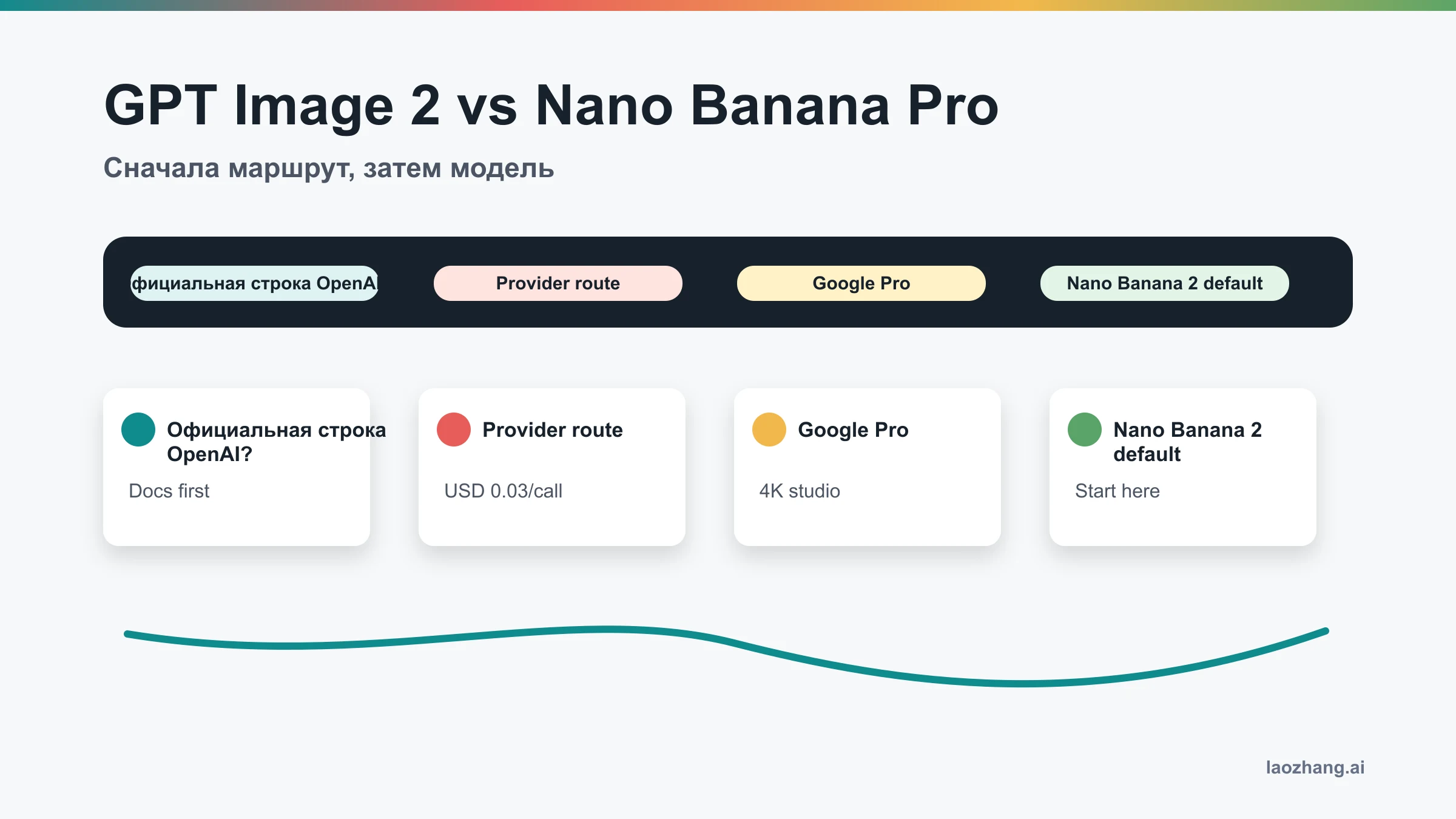 На 22 апреля 2026 года не считайте gpt-image-2 документированной публичной строкой OpenAI API. Практичный выбор делится на четыре маршрута: официальный OpenAI остается на документированных GPT Image строках; laozhang.ai gpt-image-2 можно тестировать как провайдерский доступ по $0.03/call; Nano Banana Pro нужен для дорогого финального Google-ассета; обычные Google API итерации стоит начинать с Nano Banana 2.
