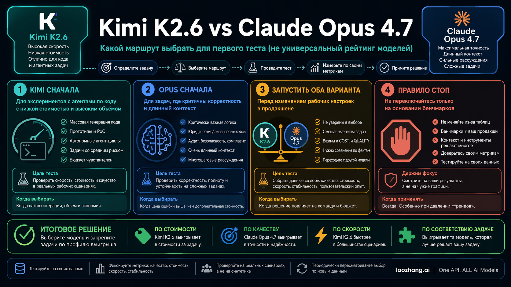 | Kimi first | Нужны дешевые большие серии coding-agent экспериментов | Цена Kimi позволяет превратить число попыток в часть стратегии | Не называйте это заменой Opus без проверки на вашем workflow |