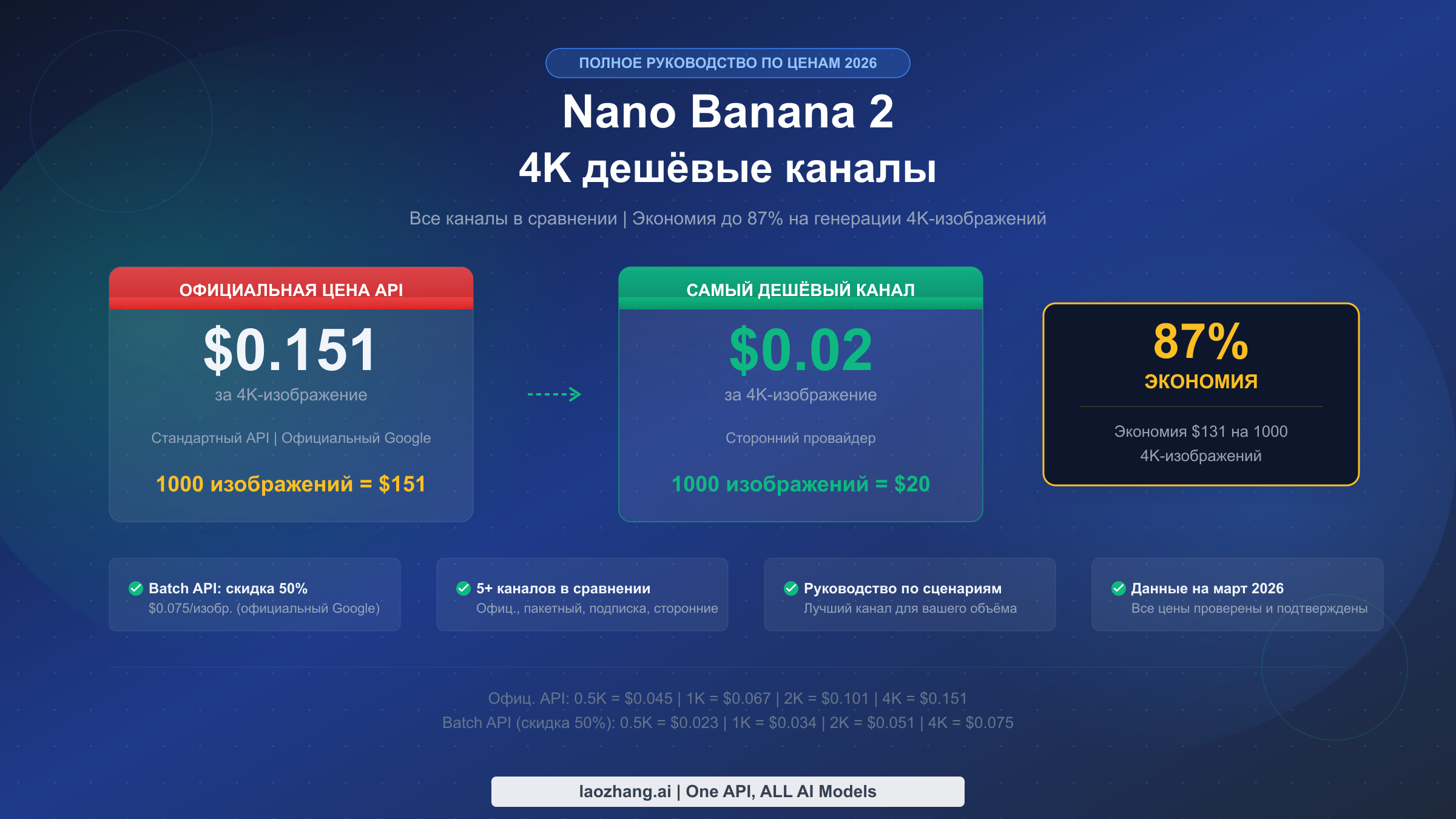 Nano Banana 2 генерирует потрясающие 4K-изображения за $0.151 через официальный API Google, но платить полную стоимость совсем не обязательно. Batch API снижает цену до $0.075 за изображение — это прямая скидка 50%, доступная каждому, кто готов подождать результат до 24 часов. Сторонние провайдеры предлагают ещё большую экономию: платформы вроде laozhang.ai работают по фиксированной ставке $0.05 за изображение независимо от разрешения, а специализированные сервисы снижают стоимость до $0.02 за генерацию в 4K. Это руководство сравнивает все каналы, доступные в марте 2026 года, от бесплатного тарифа Google до самых дешёвых сторонних API, чтобы вы нашли оптимальное решение для вашего объёма использования и бюджета.