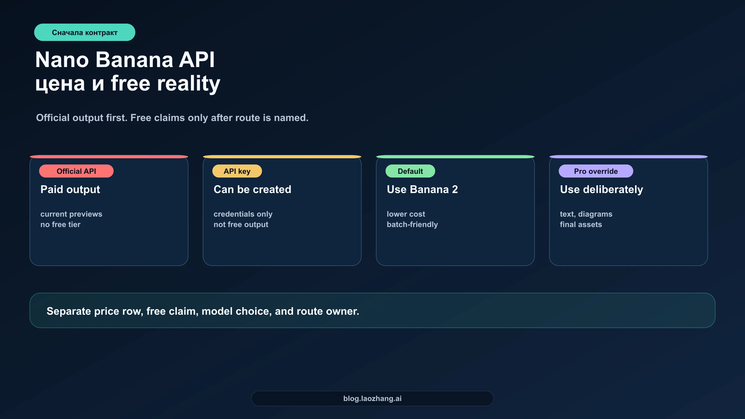 Один ответ вида «сколько стоит Nano Banana API» опасен без владельца контракта. Разработчику нужен Google price row, consumer-пользователю нужны правила продукта, а команде с gateway нужны условия поставщика.