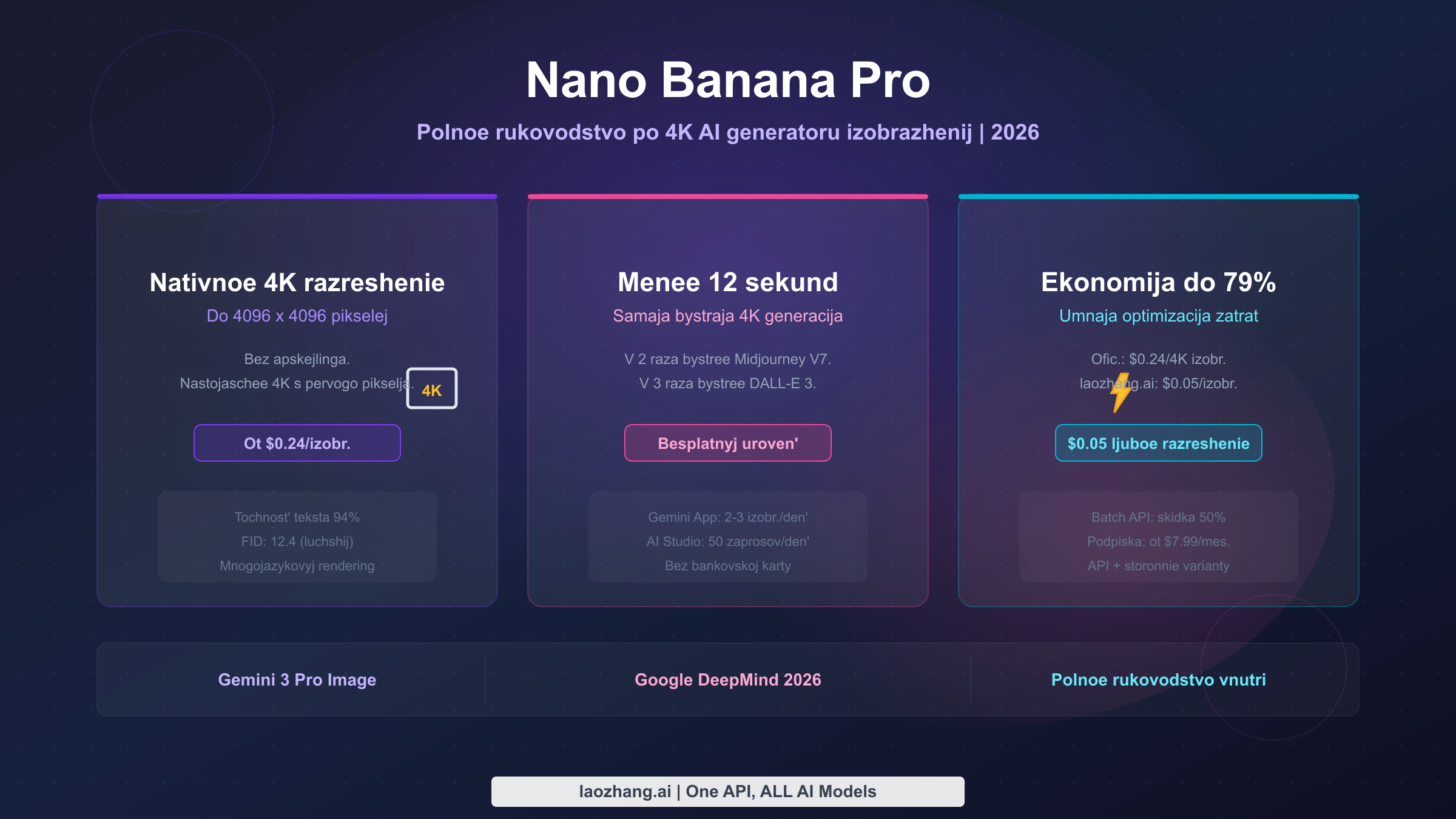 Nano Banana Pro (Gemini 3 Pro Image) генерирует нативные 4K изображения с разрешением до 4096x4096 пикселей менее чем за 12 секунд с точностью отображения текста 94%+. Официальные цены API начинаются от $0.134 за 2K изображение и $0.24 за 4K изображение (март 2026), в то время как сторонние провайдеры вроде laozhang.ai предлагают любое разрешение по $0.05 за изображение — экономия до 79%. Бесплатный доступ доступен через Google AI Studio (50 запросов/день) и приложение Gemini App (2-3 изображения/день при разрешении 1 МП).